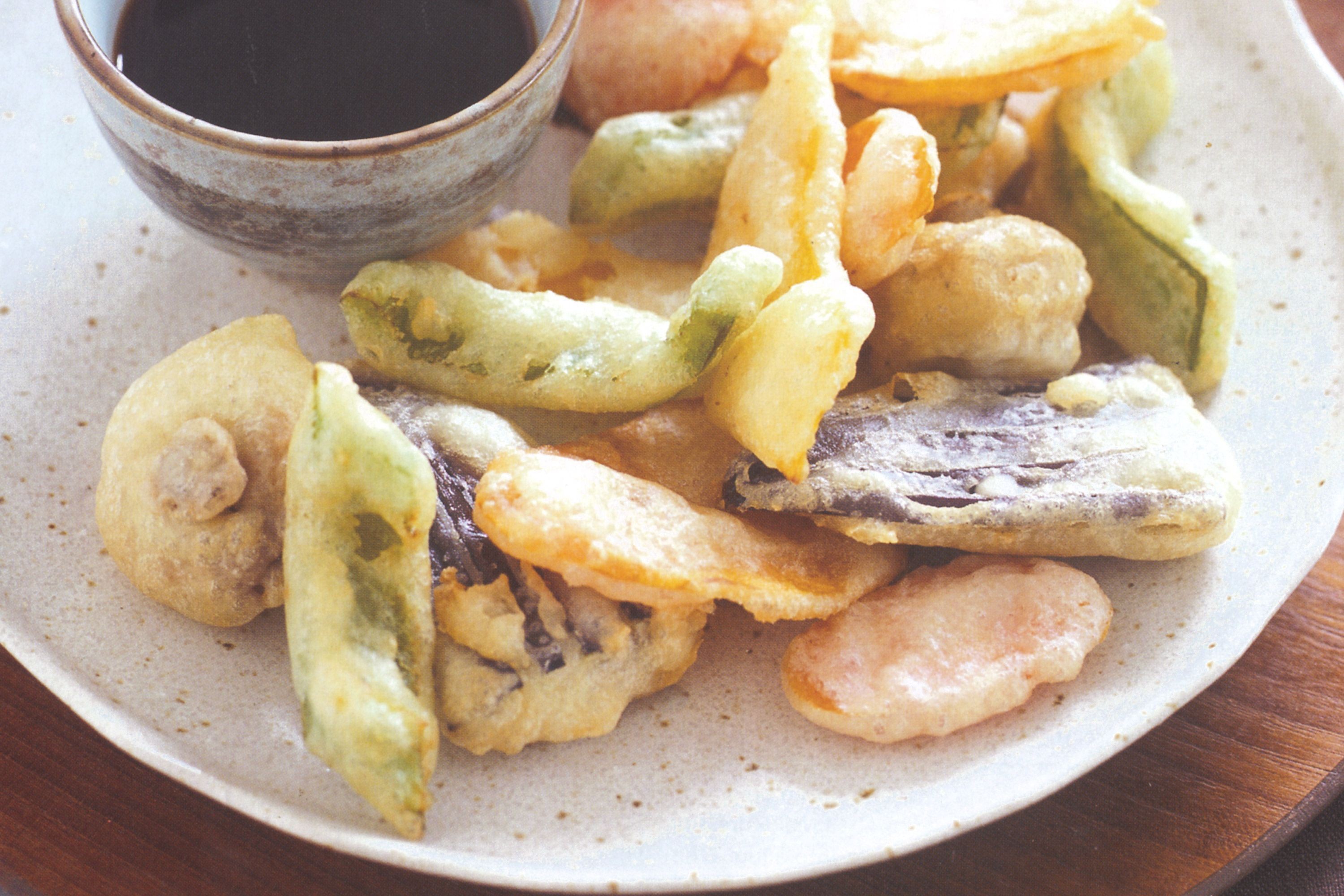 Colocar el huevo en un bol, agregar el agua helada; mezclar e incorporar la harina, el almidón y poco para hornear. Cortar el filete de pescado en cubos, pasarlos por la mezcla y luego por el aceite caliente. Cocinarlos 1 minuto. No deben llegar a dorarse. Pelar la zanahoria y cortarla en hilos con el pela patatas, la berenjena y el zapatito en finas rodajas y la cebolla en rodajas. Pasar por la mezcla y freìr. Servir el tempura de pescado con salsa de soya o gajos de limón.