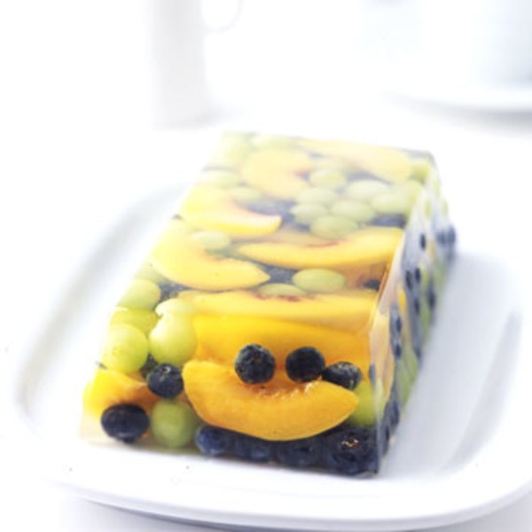 Vierte el jugo de uva en un tazón y agrega la esencia de arándano. Vacía la grenetina en 1 taza de esta mezcla, revuelve muy bien y deja reposar por 5 minutos para que se hidrate. Calienta en el microondas por 20 segundos y revuelve. Repite hasta que la grenetina esté completamente disuelta. Incorpora a la mezcla anterior y revuelve muy bien. Vierte una capa muy delgada de la mezcla de uva en un molde previamente engrasado con un poco de aceite y refrigera por 45 minutos o hasta que la gelatina cuaje (esto es para evitar que la fruta se vaya al fondo y se pegue). Acomoda las rebanadas de fresa, vierte una siguiente capa de mezcla de uva y refrigera por 45 minutos o hasta que la gelatina cuaje. Repite el procedimiento con el plátano, las uvas y los blueberries. Refrigera por 1 hora o hasta que la gelatina cuaje por completo. Desmolda y decora con blueberries.