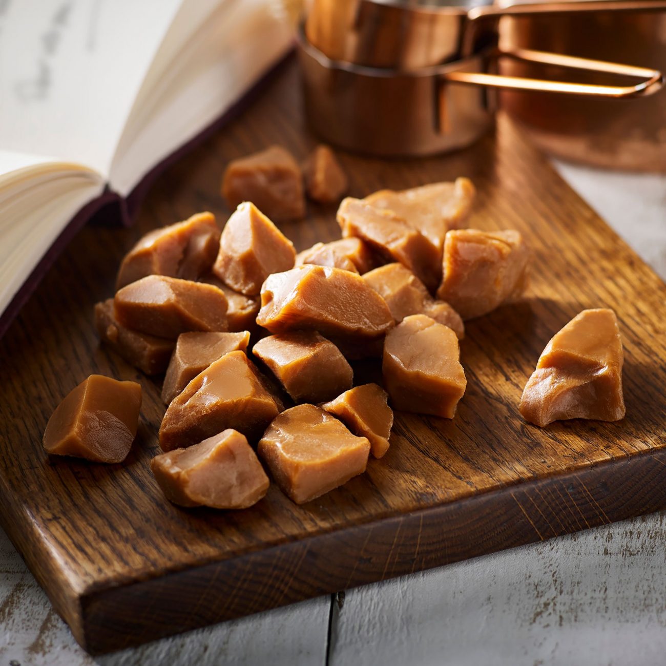 Se prepara un tapete de silicón sobre una hoja de hornear. Se aparta Con un cuchillo se pica el chocolate en trocitos y se aparta. Se tiene listo a un lado de la estufa una taza con un poco de agua, una brocha y un termómetro de cocina. En una olla de fondo grueso se combinan la mantequilla, el azúcar, el agua, la miel de maíz y la sal sobre lumbre media. Se revuelve con una cuchara de madera hasta que se disuelva bien el azúcar, entonces se deja de revolver. Luego dejamos que el termómetro de cocina llegue a los 300°F (148°C) y que la mezcla se emplace a obscurecer. De vez en cuando y tratando de no tocar el caramelo hay que limpiar los lados de la olla con el agua y la brocha de cocina para que el azocar no se cristalice. Cuando el caramelo llegue a los 300°F (ésto tardara de 18 a 20 minutos) se retira de la lumbre. Se le agrega la vainilla y se mezcla y rápidamente. Se vaya el caramelo sobre el tapete de silicón en una hoja de hornear. Se extiende con la ayuda de una espátula de silicón. Se deja enfriar 2 minutos. Enseguida se repele por encima al chocolate picado y se tapa con otra hoja de hornear para que el calor termine de derretir el chocolate. Después de 2 minutos se extiende el chocolate por arriba de todo el caramelo. Por último se espolvorea la nuez encima. Se deja enfriar durante 3 horas y luego se rompe en pedazos. Para ayudar a que el chocolate se haga sólido más rápidamente podemos refrigerar un rato el toffee antes de cortar.