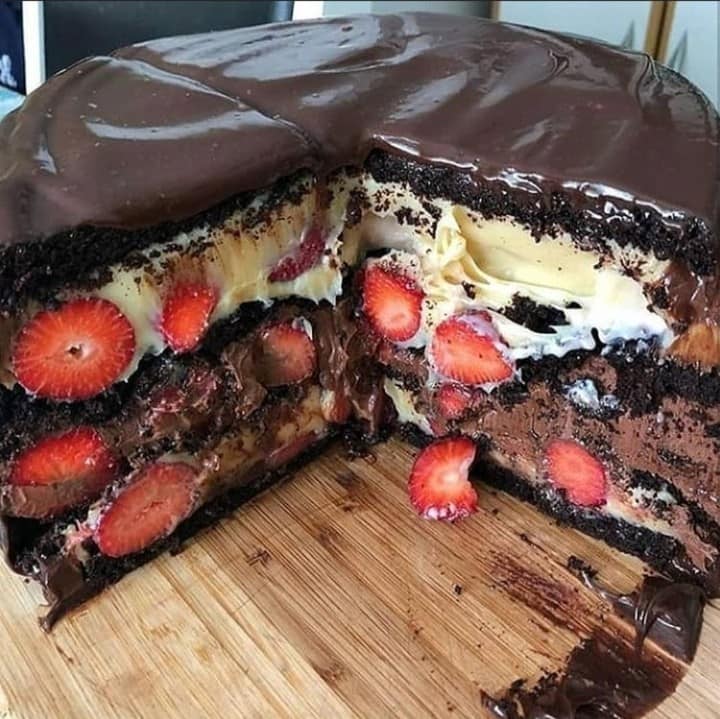 • Torta húmeda de chocolate rellena de fresas y leche condensada