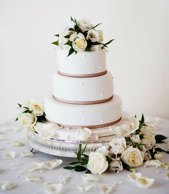Romántico pastel con un piso superior acampanado sostenido en un pedestal cubierto da encajes. Delicadas rosas trazadas de color durazno o de otro color y corazones constituyen el atractivo borde de este moderno pastel nupcial.