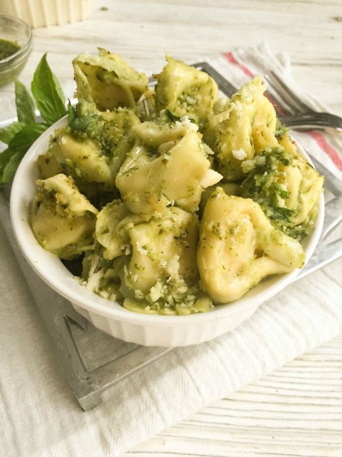 En una olla grande, hervir agua y agregar el brócoli y los tortellini. Cocinar los vegetales durante 15 minutos hasta que el brócoli esté tierno y la pasta esté al dente. En una ollita, hervir a fuego lento la salsa pesto y la taza de crema; revolver hasta que espese. Quitar del fuego y espolvorear queso parmesano encima antes de mezclarlo con la pasta y el brócoli. Servir el tortellini al pesto junto a pan de ajo.
