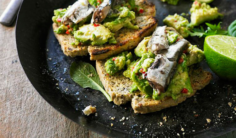 Untar las rebanadas de pan con mantequilla y poner en el grill. Poner encima de las tostadas el pimiento cortado en tiras. Con la batidora, batir bien el aguacate con el aceite, la pimienta y sazonar. Una vez bien emulsionado con una manga pastelera poner encima de los pimientos. Terminar con las sardinillas abiertas por la mitad a lo largo. Servir de inmediato.