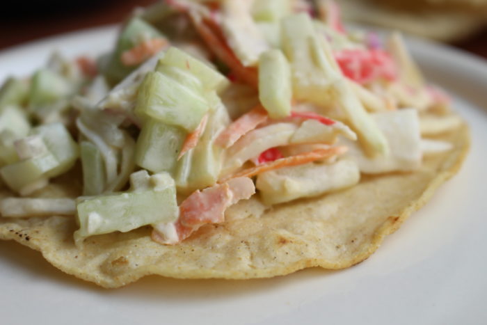 Corta el surimi en julianas pequeñas, mezcla en un tazón con la cebolla, el perejil, la salsa inglesa, el jugo sazonador, el limón, la mayonesa, la sal y pimienta. Revuelve bien. Cubre las tostadas con esta mezcla y acompaña con una rebanada de aguacate sobre cada una; sirve de inmediato.
