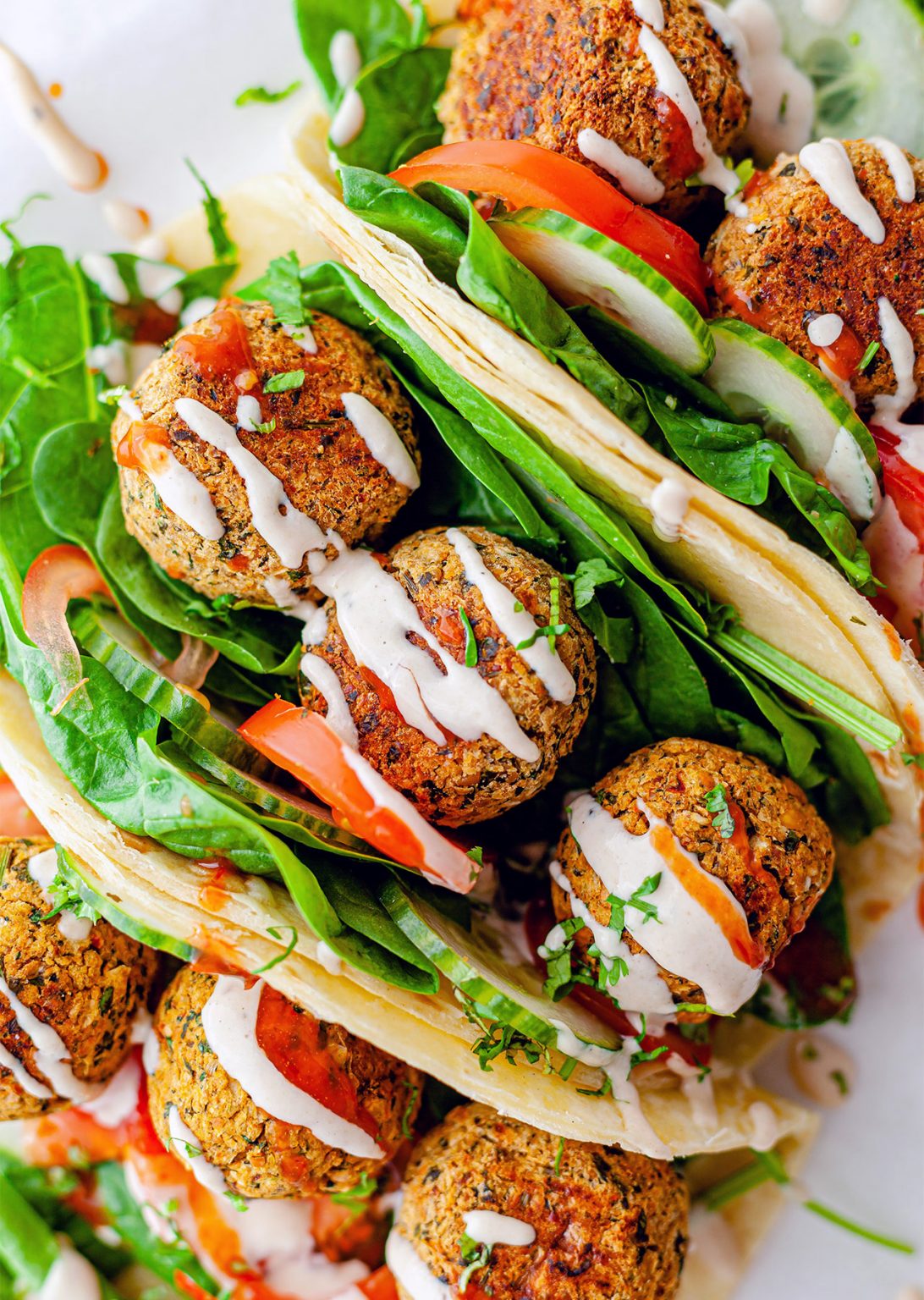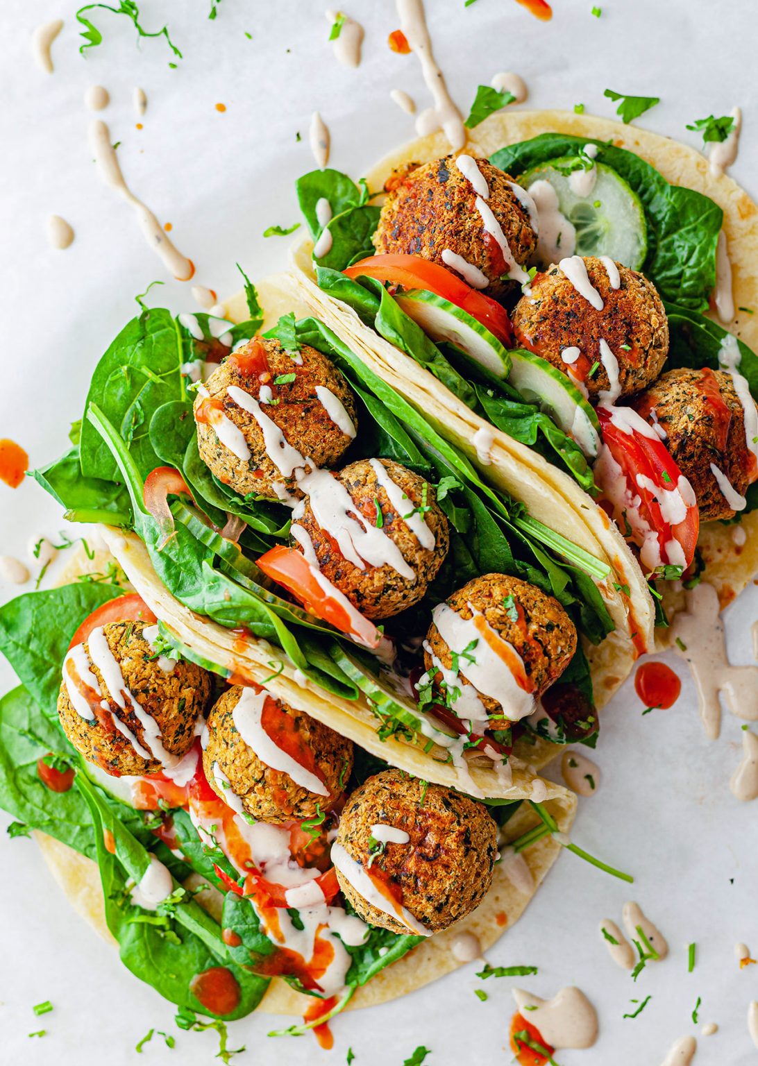 - Ci piace servire i falafel su una focaccia con lattuga, pomodoro, cetriolo, salsa piccante e salsa tahini.