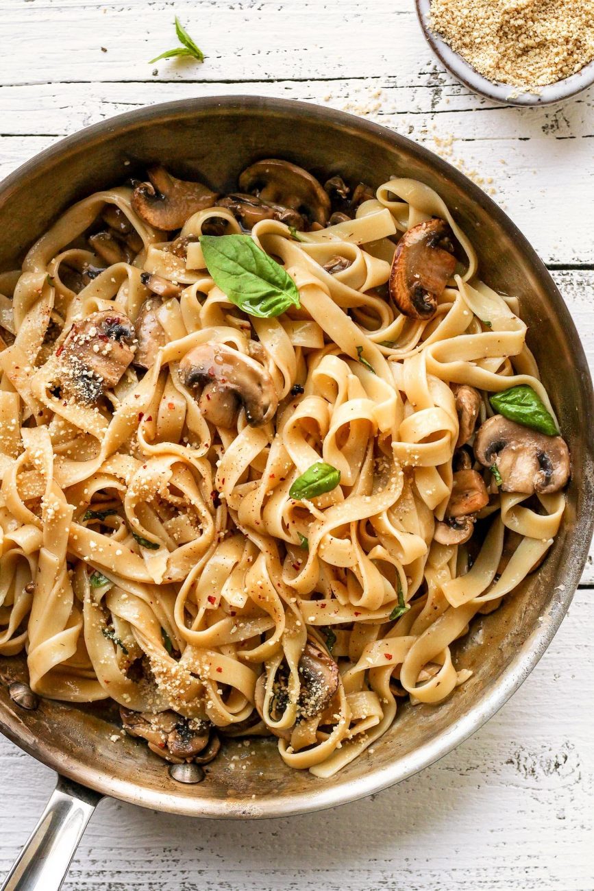 Fate tostare i pinoli in una padella antiaderente e metteteli da parte. Cuocete al dente le fettuccine in abbondante acqua salata alla quale avrete aggiunto un cucchiaio di olio, scolatele bene e tenetele in caldo. Spuntate i fagiolini verdi e affettateli per il lungo. Scaldate l’olio in una padella grande dal fondo pesante e rosolate la cipolla e l’aglio a fuoco moderato per 3 minuti. Unite i funghi e rosolateli per 1 minuto, mescolando. Aggiungete il vino, la panna e il brodo e portate ad ebollizione, dopodiché abbassate la fiamma e proseguite la cottura per 10 minuti. Battete leggermente l’uovo in una terrina. Senza smettere di mescolare, aggiungete un pò di liquido di cottura dei funghi e amalgamatelo bene. Versate lentamente l’uovo sbattuto nella padella con i funghi e continuate a mescolare per 30 secondi. Aggiungete i fagiolini, il basilico, i pinoli e i pomodorini e mescolate per qualche minuto. Condite con sale e pepe a piacere. Distribuite le fettuccine nei piatti individuali caldi e versateci sopra il condimento, quindi guarnite con le scaglie di grana e servite immediatamente in tavola.