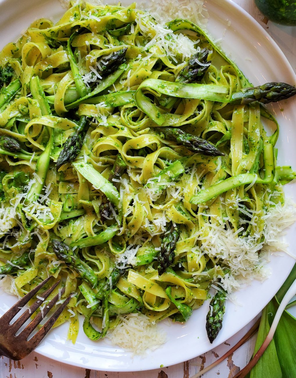 Pecorino o Parmigiano grattugiato al momento, una bella spruzzata di limone fresco e scaglie di peperoncino contribuiranno a rallegrare e completare questo piatto. E, naturalmente, se hai Manchego o altro formaggio a pasta dura croccante preferito che preferisci usare, fallo! Questo piatto è un modo semplice per mostrare gli asparagi primaverili e le erbe fresche o le rampe. Ecco un ottimo consiglio: perché non aumentare la quantità di asparagi e ridurre la quantità di pasta nella ricetta? Finirai con un piatto più vegetariano e meno carboidrati. Poiché le scaglie di asparagi imitano davvero le fettuccine, non ti accorgerai nemmeno se c’è meno pasta nel piatto! E sì, in estate, quando hai troppe zucchine sul bancone, sostituisci le scaglie di asparagi con le tagliatelle di zucchine e le fettuccine con gli spaghetti, e usa un pesto di spinaci, e questo piatto prende una nuova vita!