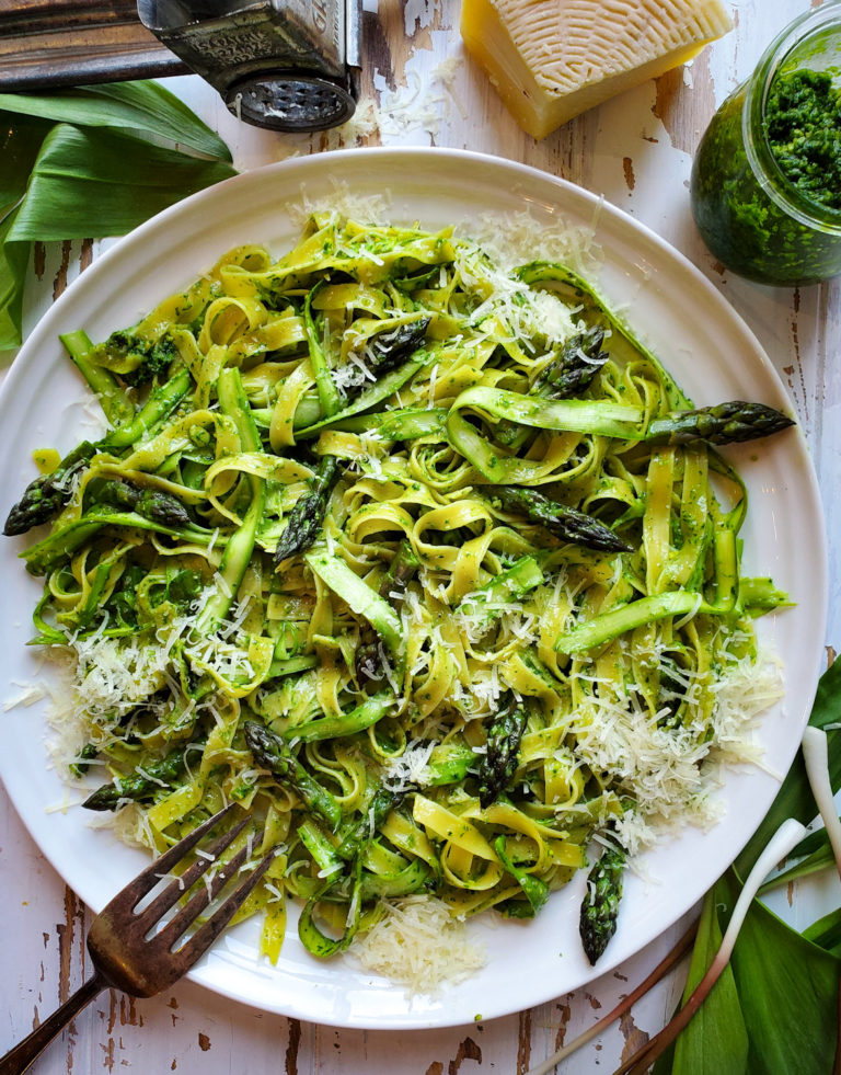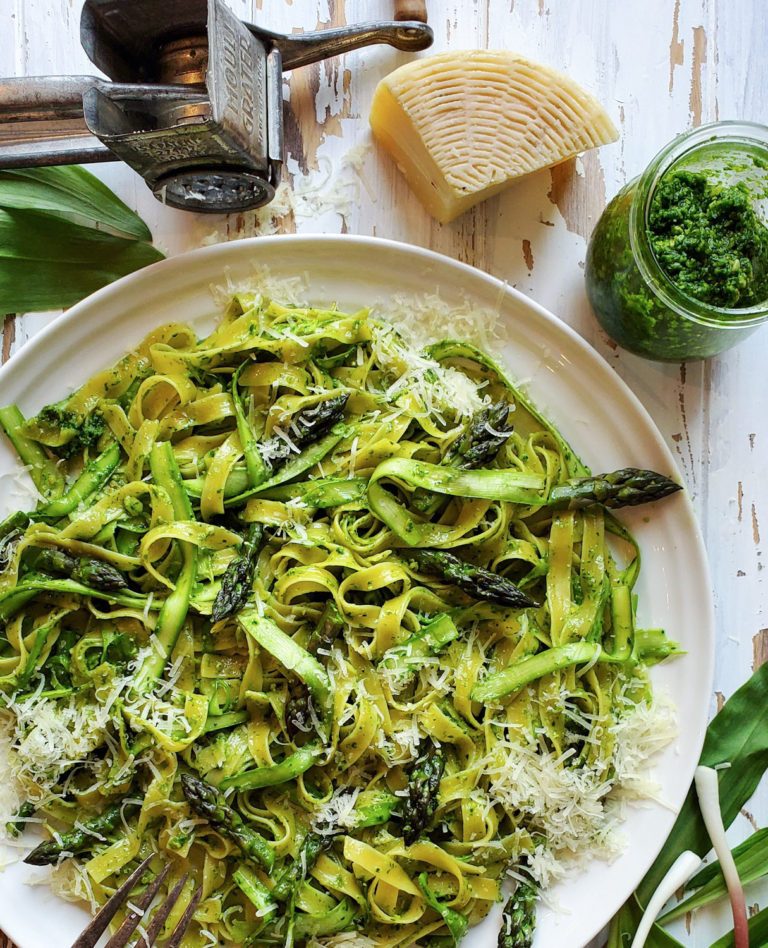 Asparagi primaverili e rampe si uniscono in questo cremoso piatto di pasta fresca. La cottura della pasta in meno acqua fa sì che l’acqua diventi cremosa dell’amido della pasta, che servirà per diluire il pesto. Naturalmente, sentiti libero di usare qualsiasi pesto di tua scelta se non riesci a trovare le rampe.
