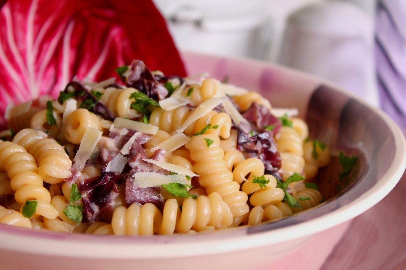 Lavate e spuntate i fagiolini; spezzettateli e lessateli in acqua bollente salata con la pasta. Nel frattempo, mondate e lavate le verdure. Tritate grossolanamente il radicchio e tagliate a cubetti i pomodori. Riunite gli ingredienti preparati, in una ciotola e conditeli con un’emulsione di olio, basilico tagliuzzato, sale e pepe. A fine cottura, sgocciolate i fusilli e i fagiolini, raffreddateli sotto l’acqua corrente e scolateli perfettamente; poi, trasferiteli nella terrina con l’insalata. Completate con le mandorle triturate e il parmigiano a scaglie; mescolate e lasciate insaporire per una decina di minuti, prima di servire.