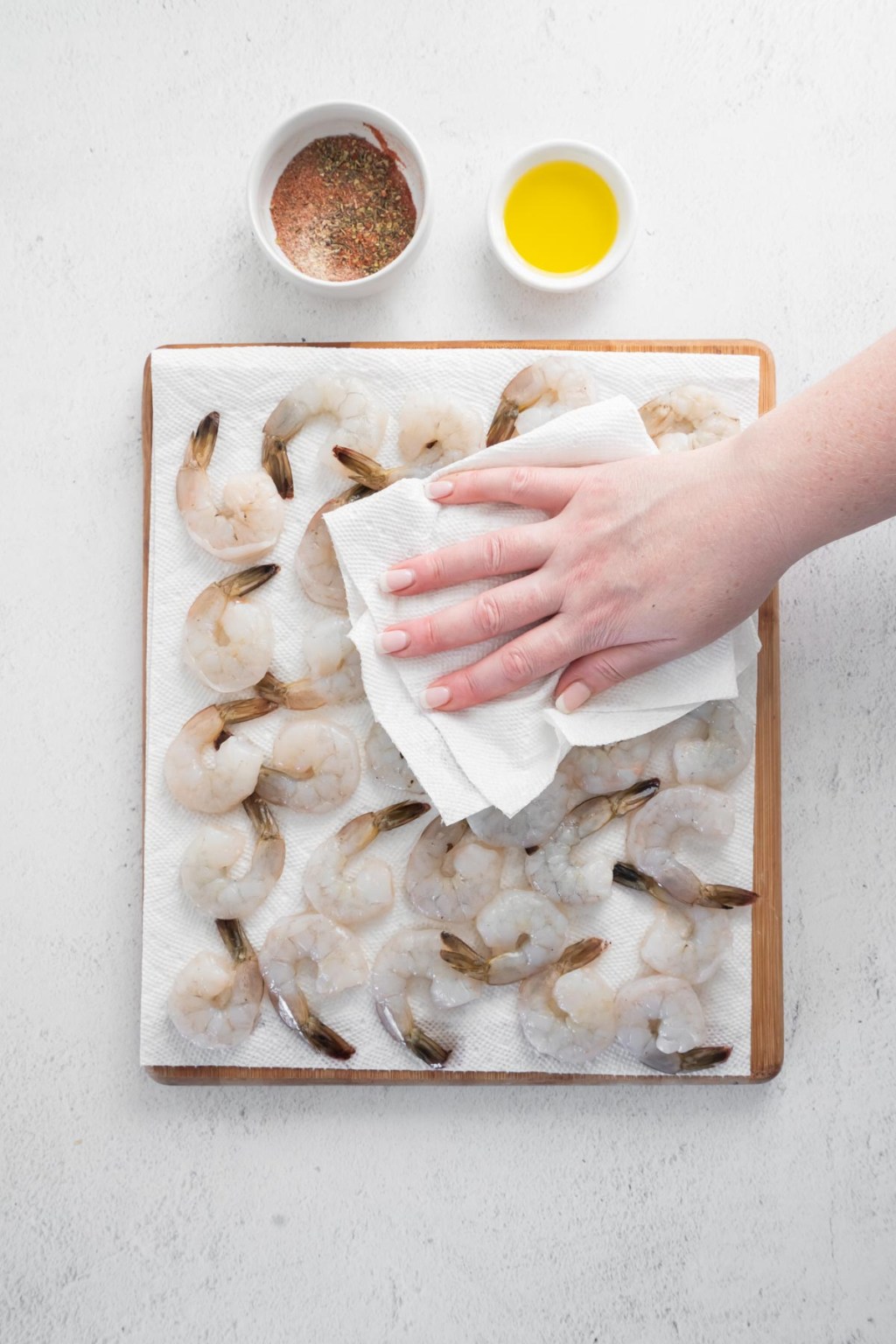 - Asciugate i gamberi con carta assorbente. Asciugare bene i gamberi aiuta l’olio e i condimenti ad attaccarsi.