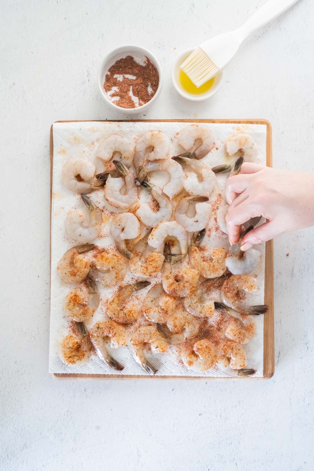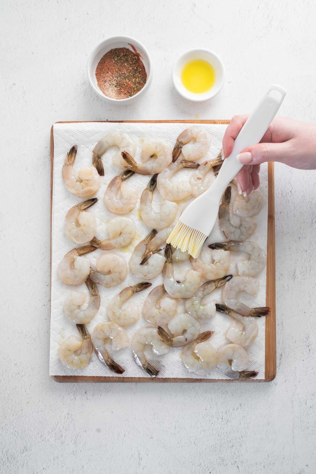 - Olio d’oliva: Spennellare i gamberi con una piccola quantità di olio d’oliva aiuterà i condimenti ad attaccarsi.