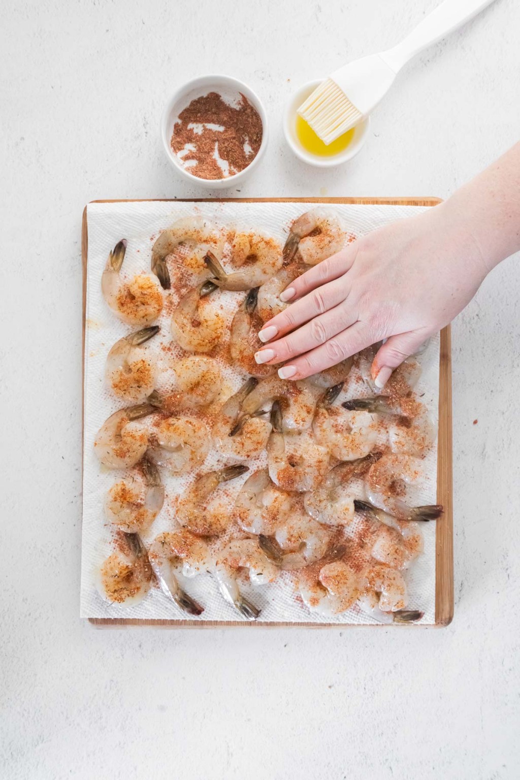 - Amalgamare delicatamente i condimenti sui gamberi con le dita. Capovolgere i gamberi e spennellare con l’olio d’oliva rimasto. Cospargere con il resto dei condimenti e tamponare per aiutare i condimenti ad attaccarsi ai gamberi.