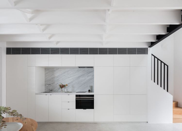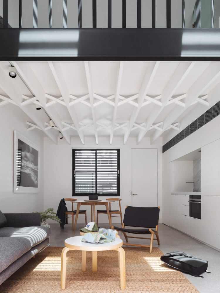 Quello che era un posto auto coperto è stato trasformato in una piccola casa con 1 camera da letto distribuita su 2 piani, con un layout aperto che integra i diversi spazi con un’estetica loft.