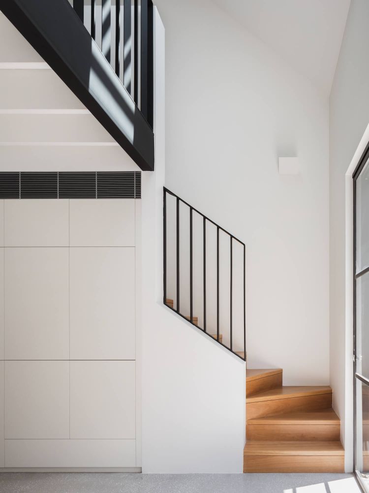 La scala che porta al piano superiore, con ringhiera in metallo nero e gradini in legno. Accanto alla grande finestra c’è una zona a doppia altezza su cui la camera da letto ha un balcone.