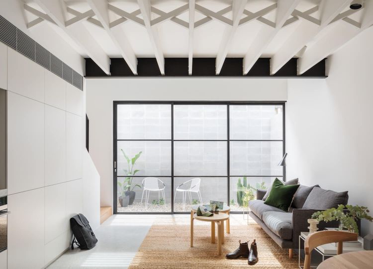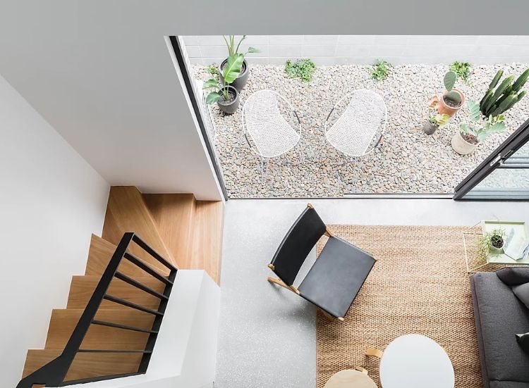 Vista dal soppalco. La finestra scorrevole permette un’ampia apertura che mette in comunicazione l’interno della casa con il patio. Il patio è molto piccolo e richiede poca manutenzione con pietre o ghiaia come copertura del terreno.