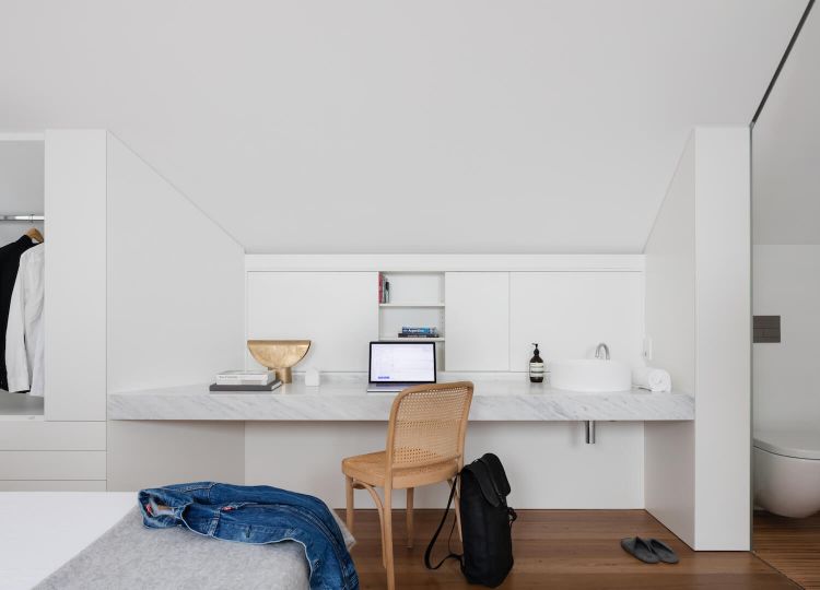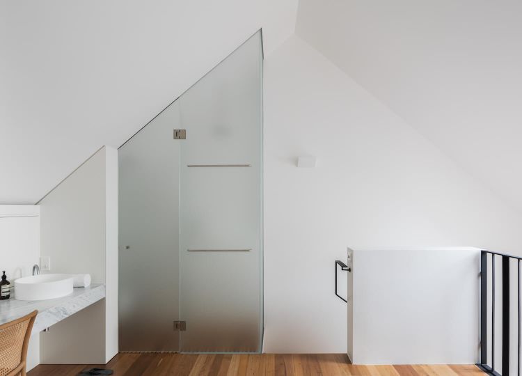 Al piano superiore si trova la camera da letto e il bagno compartimentato. Il settore delle docce e dei servizi igienici era situato ad un’estremità che è chiusa con un muro e una porta, entrambi realizzati in vetro traslucido. Un top in marmo si estende da una colonna strutturale all’armadio, creando uno spazio per sostenere il lavabo e anche un piccolo spazio di lavoro, con mensole nascoste nel muro.
