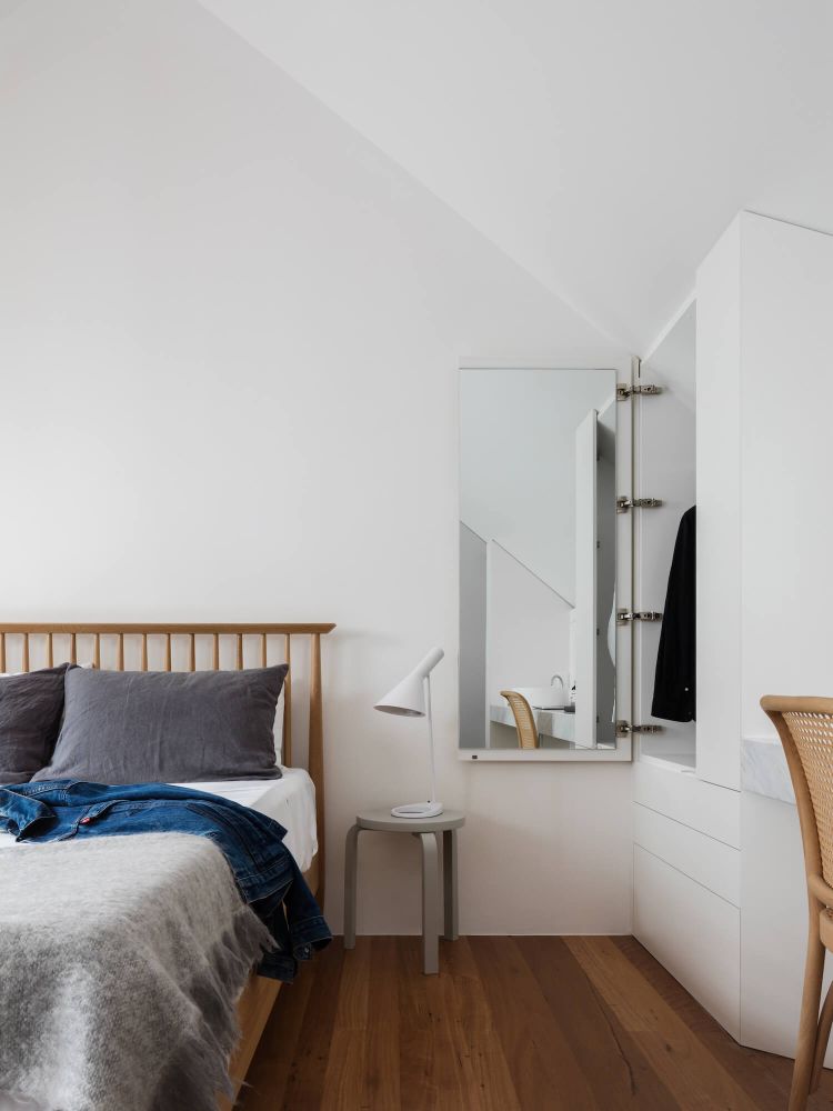 A differenza del piano terra, per la stanza è stato scelto un pavimento in legno per creare un’atmosfera più calda. Il letto, sempre in legno, riprende il design nordico degli altri mobili della casa. Come comodino, un tavolino grigio e una lampada da tavolo classica e moderna disegnata da Arne Jacobsen.