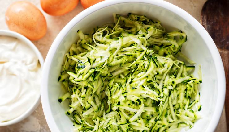 Spunta le zucchine e grattugiale con i fori normali di una grattugia. Spremi le zucchine grattugiate per eliminare l’acqua di vegetazione, ripetendo l’operazione alcune volte.