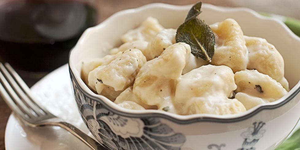 Lessate per 15-20 minuti le patate in abbondante acqua salata o cuocetele nel forno a microonde, salatele abbondantemente, scolatele e schiacciatele con lo schiacciapatate. Trasferite la purea in una terrina e cospargetele di farina con una mano mentre con l’altra mescolate accuratamente. Continuate ad impastare finché avrete incorporato tutta la farina e l’impasto si presenterà liscio ed omogeneo. Dividete l’impasto in tre parti uguali e formate per ciascuna un rotolino dello spessore di 2 cm. Tagliate i rotolini a pezzetti lunghi 2,5 cm e con le mani infarinate schiacciateli sopra una forchetta per appiattire un lato (le scanalature consentiranno al condimento di aderire meglio agli gnocchi). Riempite d’acqua una pentola grande e portatela a ebollizione. Aggiungete gli gnocchi, abbassate la fiamma e lasciateli cuocere per 2 o 3 minuti o finché saliranno in superficie. Scolate gli gnocchi con un mestolo forato e metteteli in una terrina da portata calda. Versate la panna in un pentolino e portatela ad ebollizione. Lasciate bollire la panna per 5 minuti, mescolando, finché si sarà ridotta a un terzo. Toglietela dal fuoco e incorporate il gorgonzola, sale e pepe. Versate la salsa sugli gnocchi, cospargeteli con l’erba cipollina e servite immediatamente in tavola.