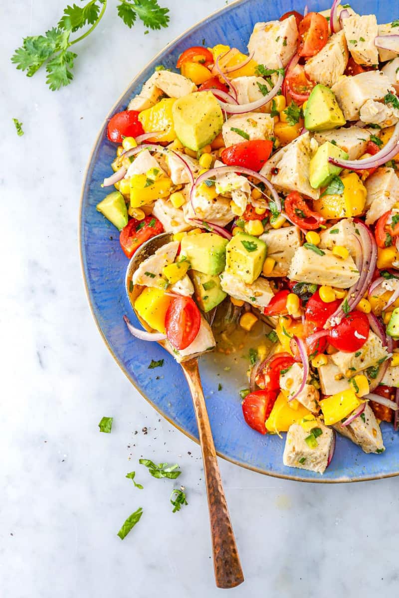 - Per preparare la salsa non vi resta che mescolare in una ciotola tutti gli ingredienti citati. Mentre in una grande ciotola, mescolare il pollo, frutta e verdura. Infine versate il condimento, mescolate per insaporire bene e condite a piacere.