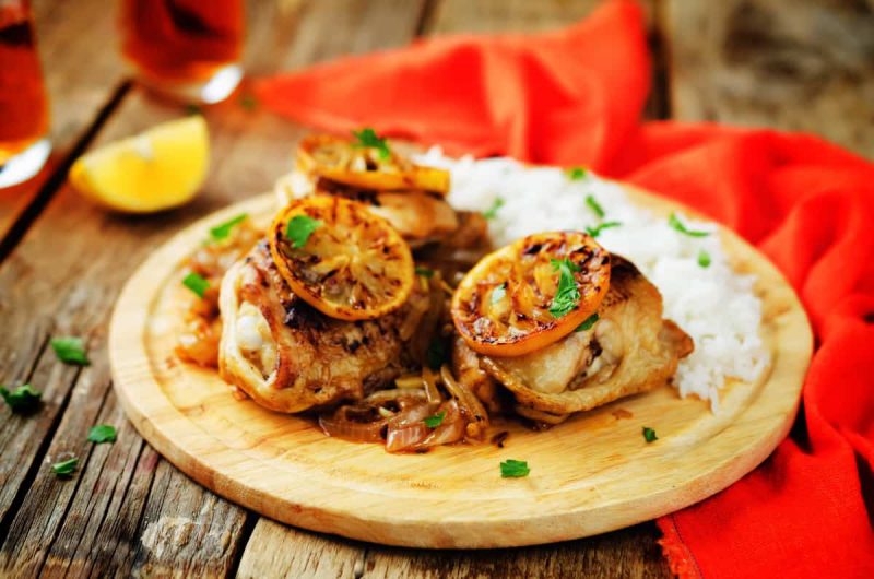 - Capovolgere il pollo, versare il limone, il rosmarino, l’aglio e guarnire con i limoni affettati. Infine, cuoci per 30-35 minuti o finché non vedi che il pollo è cotto, poiché tutto varia in ogni forno. Per 4 porzioni, servite con più verdure o una porzione di riso.