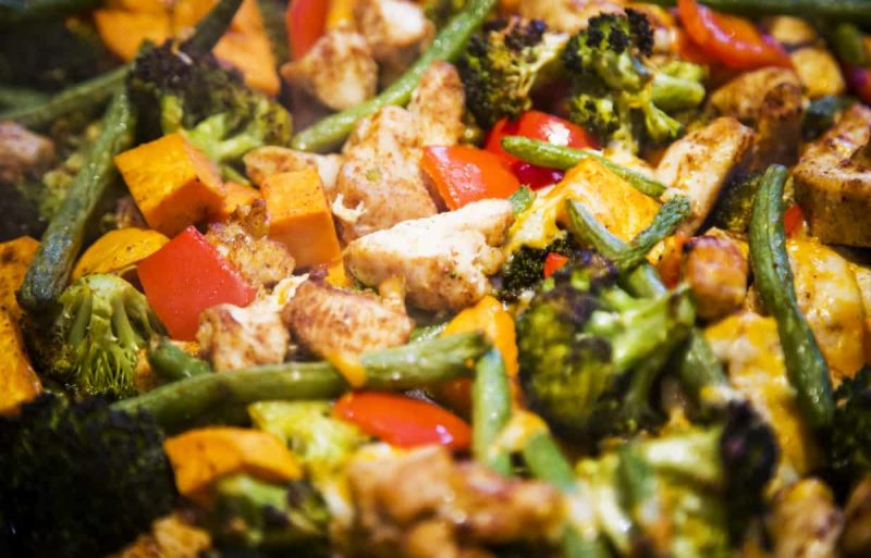 - Preriscaldare il forno a 450ºF (232°C) e coprire una teglia con un foglio di alluminio, quindi posizionare il pollo e le verdure. Cospargere uniformemente tutte le spezie e l’aglio. Irrorare con olio e cuocere per 15-20 minuti finché il pollo non sarà tenero, servire e accompagnare con una porzione di riso. Puoi coprirlo e conservarlo in frigorifero per un massimo di 5 giorni. Per 4 porzioni.