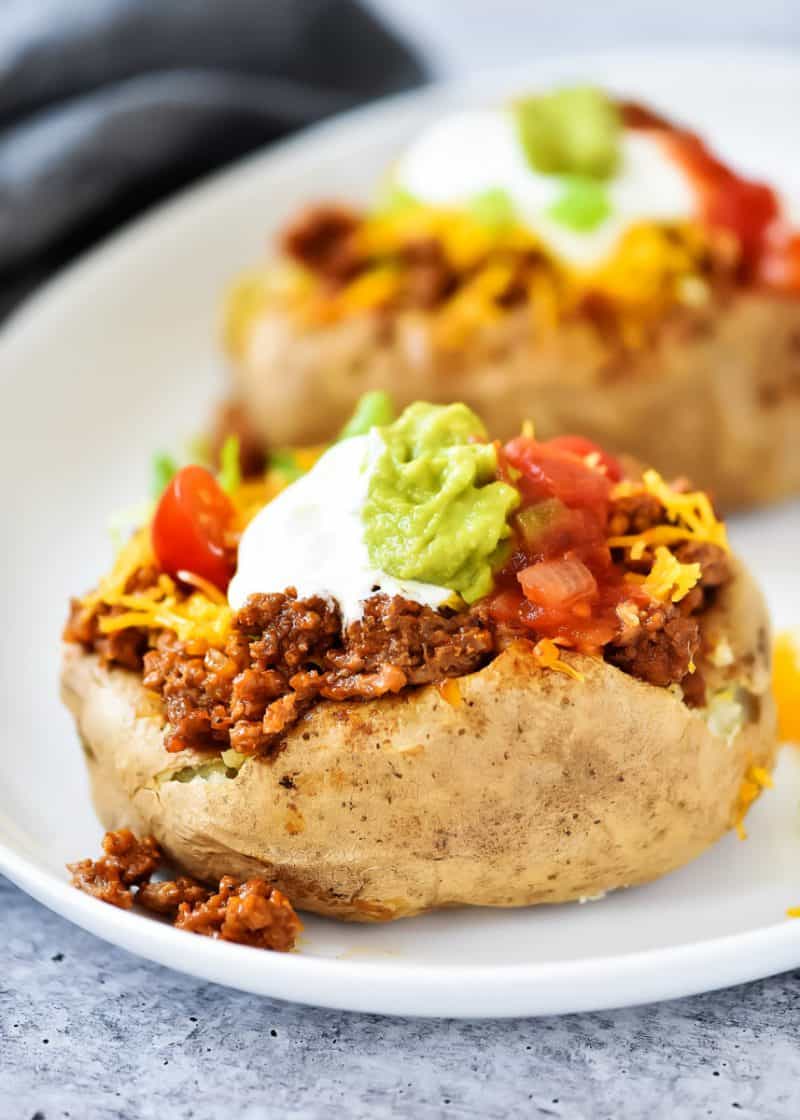 - Inizia preriscaldando il forno a 400ºF (204°C). Poi lavate e asciugate le patate, bucherellatele, avvolgetele in un foglio di alluminio e infornate per 1 ora. Trascorso il tempo, scolateli con cura e lasciateli raffreddare un po’. In una padella, invece, a fuoco medio-alto bisogna rosolare e sminuzzare la carne macinata (scolare il grasso, se c’è), aggiungere il condimento per tacos e la quantità d’acqua necessaria fino a portare a bollore, quindi abbassare la fiamma e cuocere per 10 minuti.