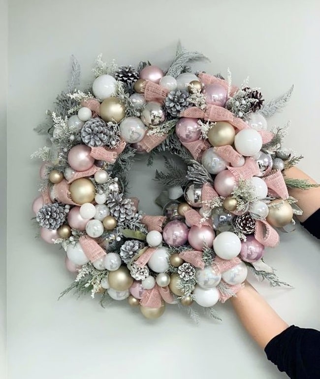 Le ghirlande natalizie sono un altro di quegli elementi che non possono mancare in una decorazione natalizia. Se hai optato per il rosa, puoi creare una corona spettacolare con tanti ornamenti di diverse dimensioni e diverse sfumature di rosa. Mescola pigne e sfere con altri colori, dall’argento, al bianco e persino al rame.
