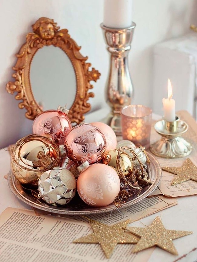 Centrotavola o piccole nature morte su superfici sparse per la casa sono un’altra opzione di decorazione natalizia che ci piace molto. In questo caso possiamo utilizzare le palline di Natale rosa mescolate con delle candele.