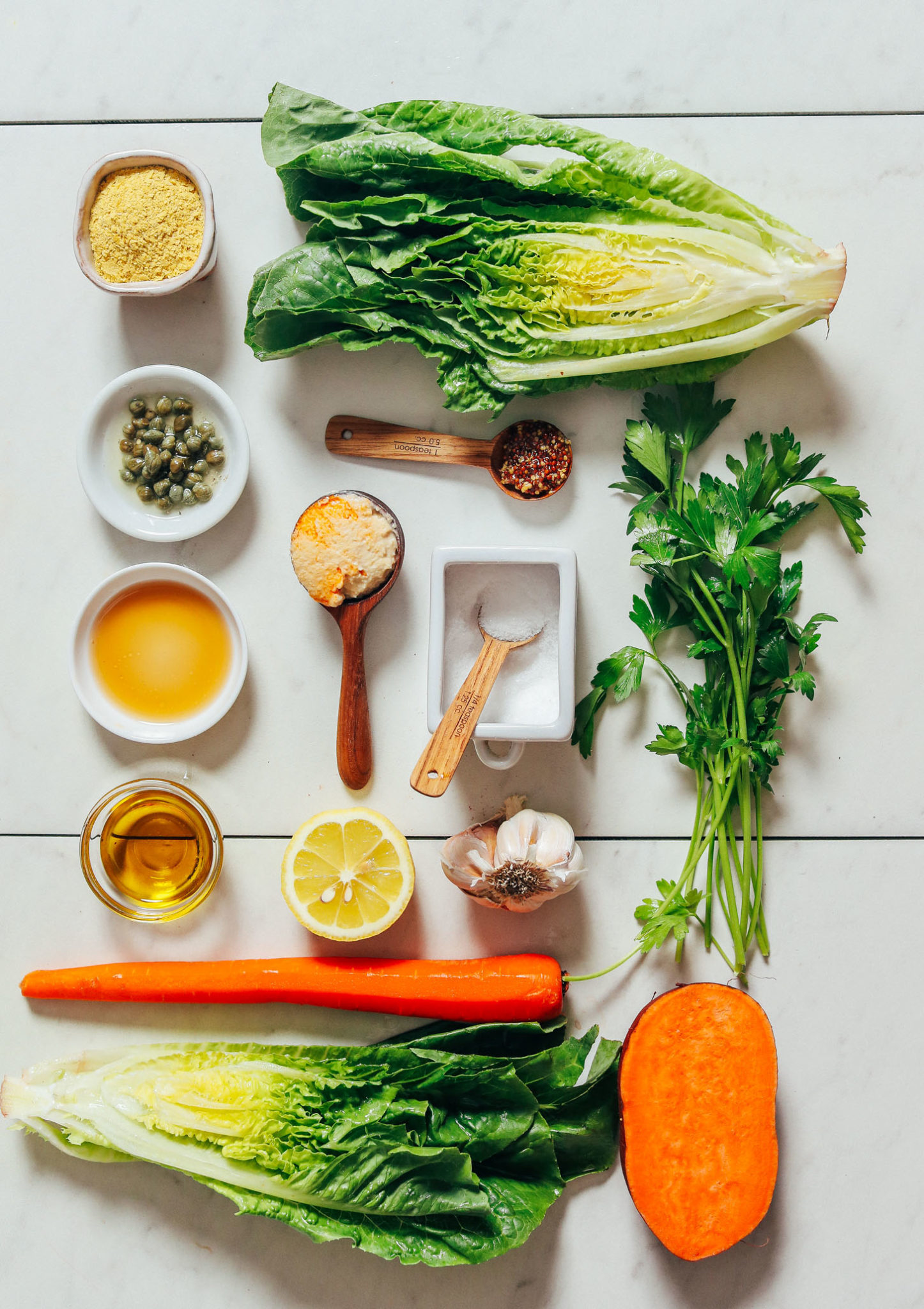 - Quindi, prepara gli ingredienti rimanenti, tra cui la lattuga romana, il prezzemolo e le carote tritate. Quindi aggiungere tutto in un piatto da portata o in una ciotola e guarnire con patate dolci e lievito alimentare (facoltativo).