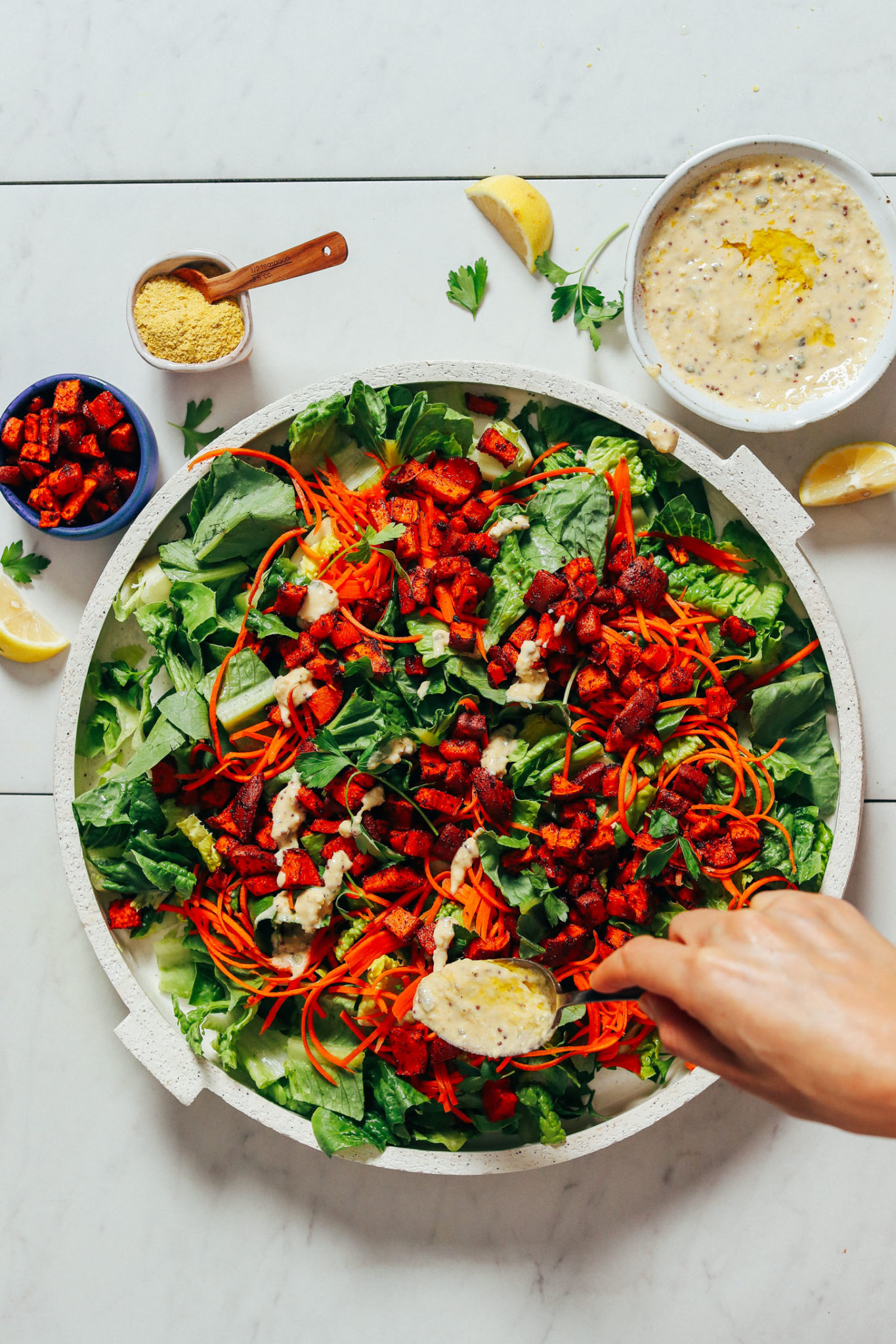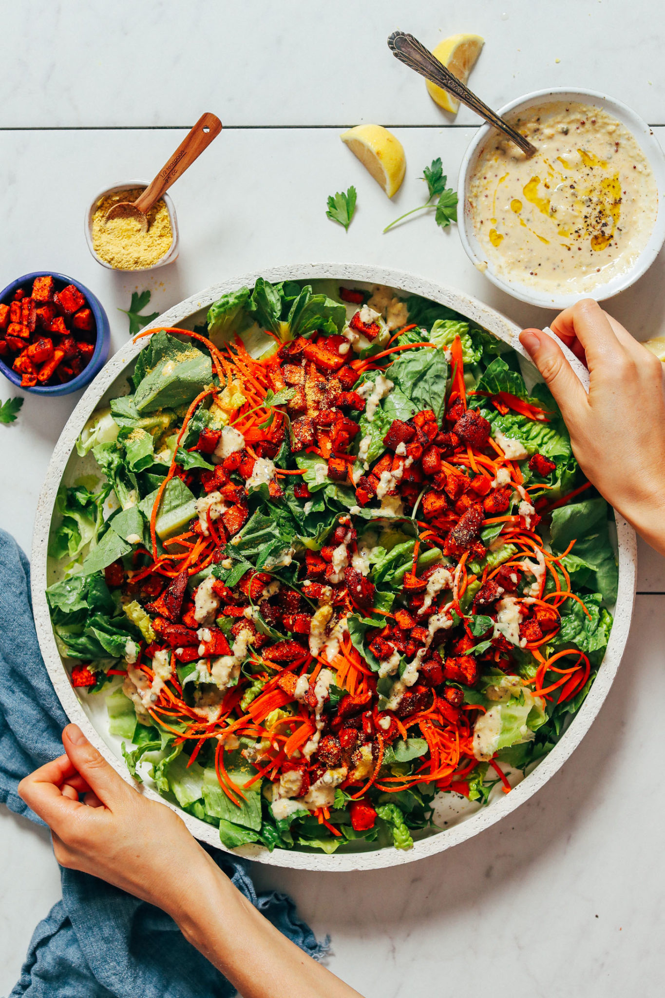 L’insalata Caesar si è ora diffusa in tutto il mondo e ha subito molte modifiche. La nostra versione non è tradizionale, ma è una versione vegetale a base di lattuga romana e un condimento simile all’aglio e piccante!