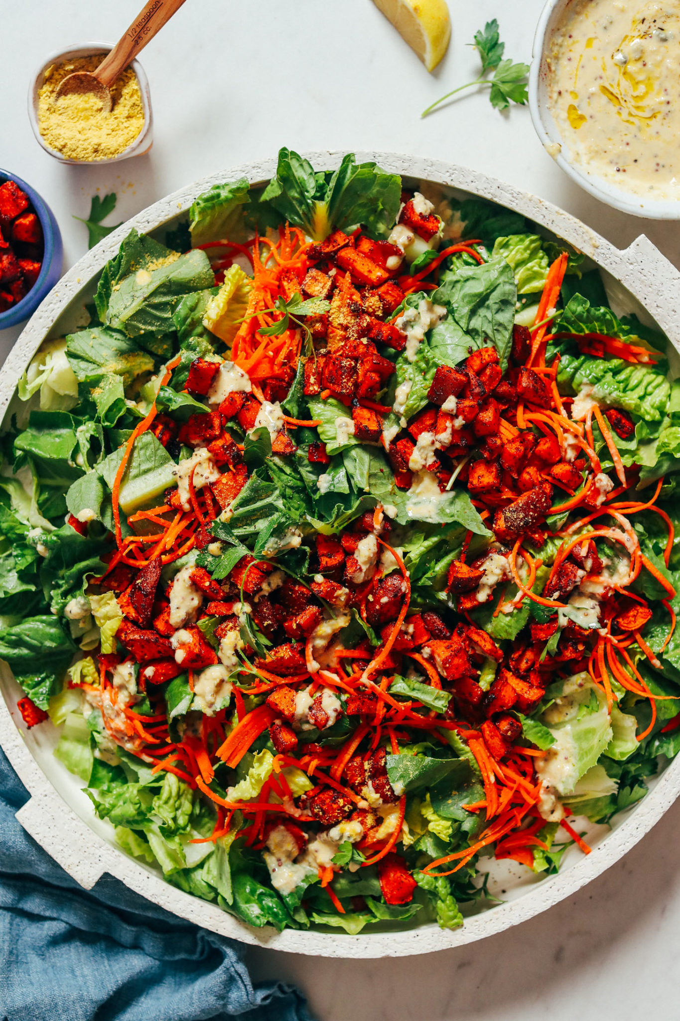 Un’insalata verde facile e veloce con carote sminuzzate, crostini di patate dolci al barbecue arrosto, prezzemolo fresco e un piccante condimento Caesar di 5 minuti. Sono necessari solo 30 minuti!