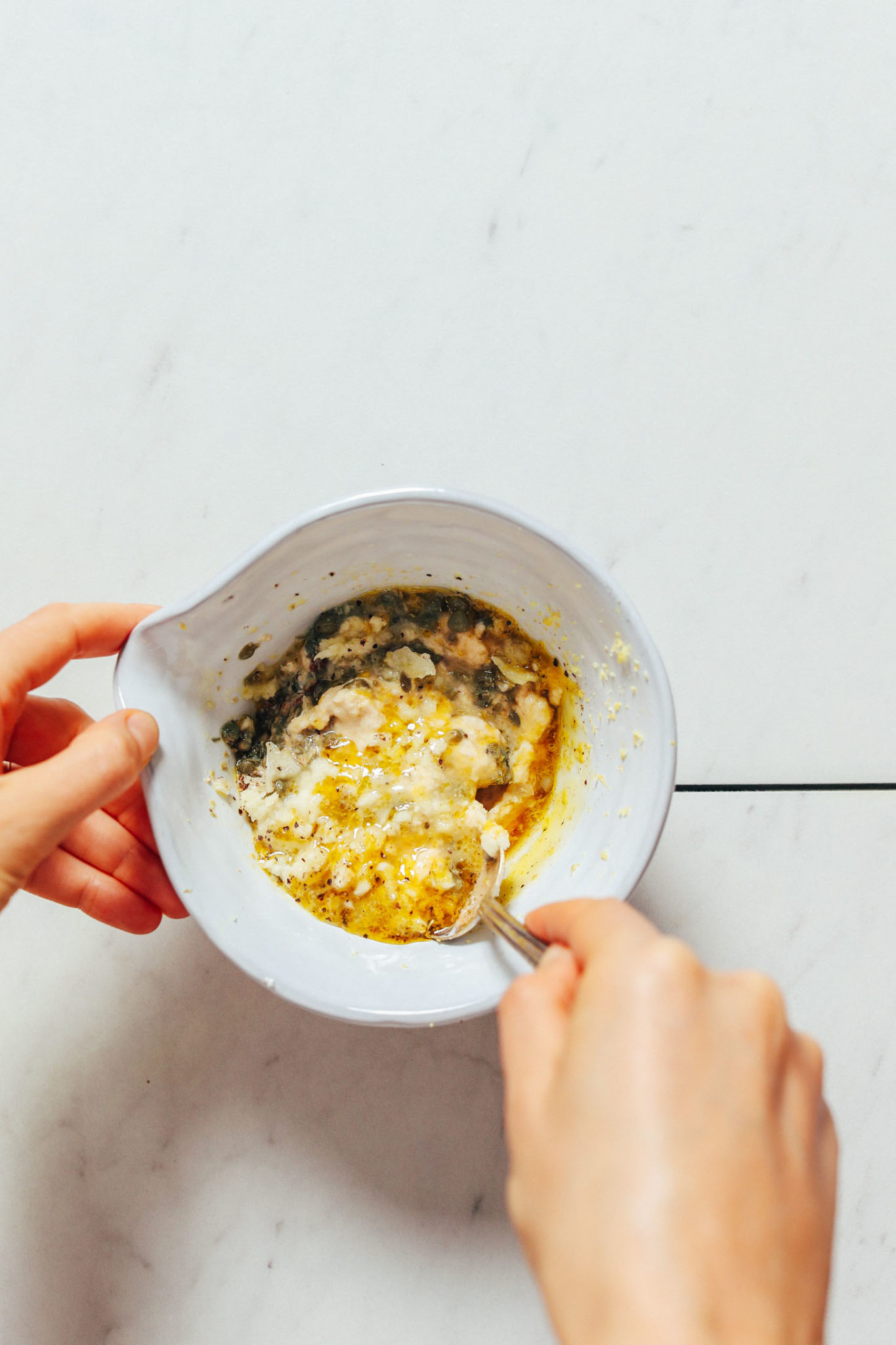 - Assaggia e aggiusta il sapore secondo necessità, aggiungendo più sale e pepe a piacere, succo di limone per l’acidità, scorza di limone per un vivace sapore di agrumi, aglio tritato per il sapore, capperi per il sapore “mare”, sciroppo d’acero per dolcezza o senape per spezie.