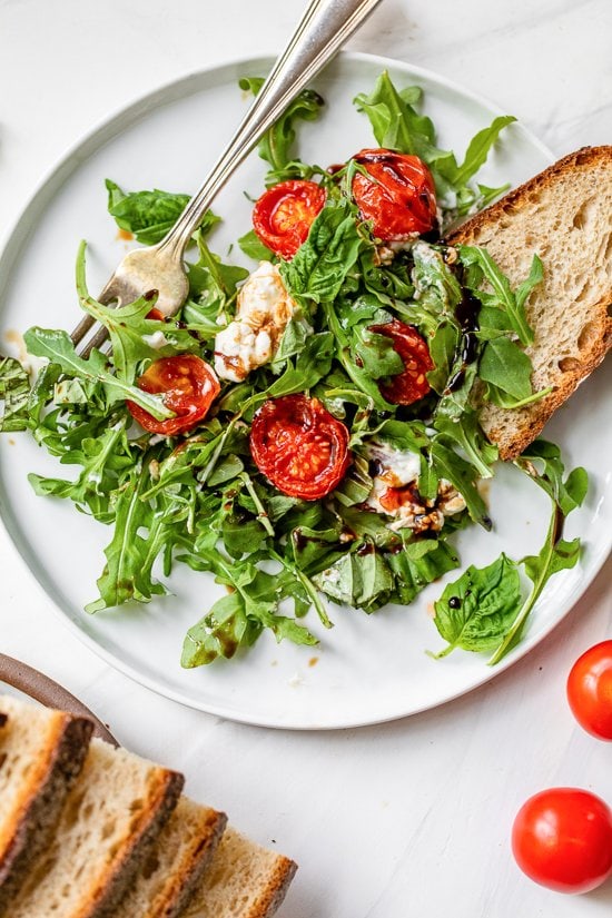 Una classica insalata caprese è composta da pomodori e mozzarella conditi con olio d’oliva e conditi con basilico fresco, sale e pepe. In questa ricetta cambio le cose usando pomodorini cotti nella friggitrice ad aria fino a quando non sono succosi e pieni di sapore. Li servo con burrata su rucola per renderlo più ripieno e condisco con glassa di aceto balsamico per un sapore in più.
