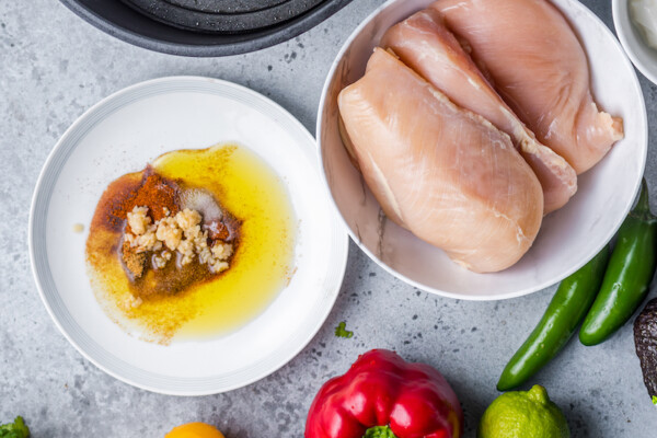 - Per la marinata di pollo: avrai bisogno di olio d’oliva, succo di lime, aglio fresco (tritato), paprika affumicata, cumino e sale.