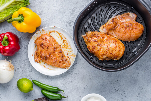- Non sovraffollare la friggitrice ad aria: se i pezzi di pollo sono impilati uno sopra l’altro, non cuoceranno in modo uniforme o otterranno quel bel salmerino arrosto. Ho usato una grande friggitrice ad aria in stile cestino e avevo molto spazio per 3 petti (1 libbra (453 g) di pollo).