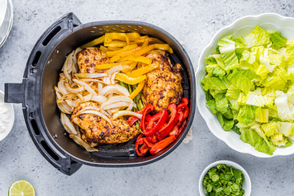 Insalata con fajita di pollo nella friggitrice ad aria