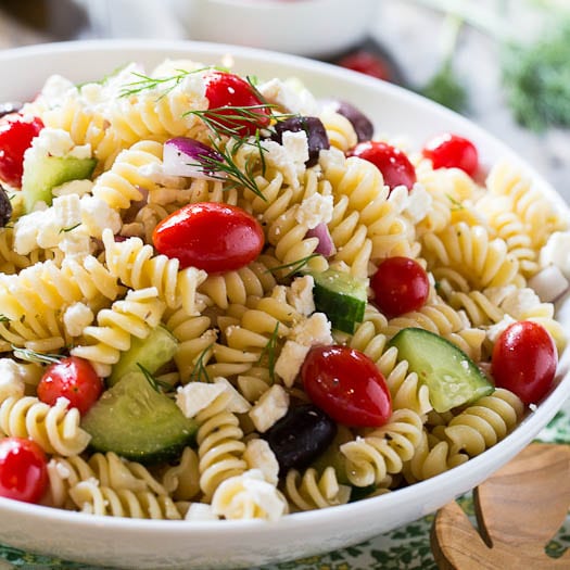 Mettete nella ciotola, dove poi metterete la pasta, i pomodorini, lo spicchio d’aglio, il formaggio feta a cubetti e l’olio. Lasciate riposare questo sugo per mezz’ora. Nel frattempo friggete le melanzane in un po’ d’olio e, quando belle dorate, scolatele bene su della carta assorbente e salatele ma non troppo. Cuocete la pasta al dente, scolatela e fatela raffreddare con un getto veloce di acqua fredda. Scolatela nuovamente, asciugatela e versatela nella ciotola del sugo dove avrete aggiunto le melanzane, i peperoni tagliati a listarelle e le olive snocciolate. Mescolate ricordandovi di togliere lo spicchio di aglio e servite a temperatura ambiente decorando con qualche fogliolina di basilico.