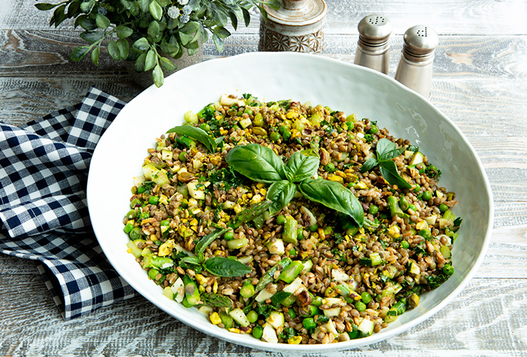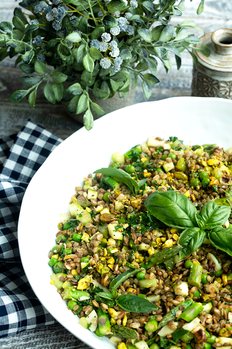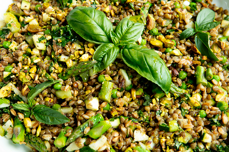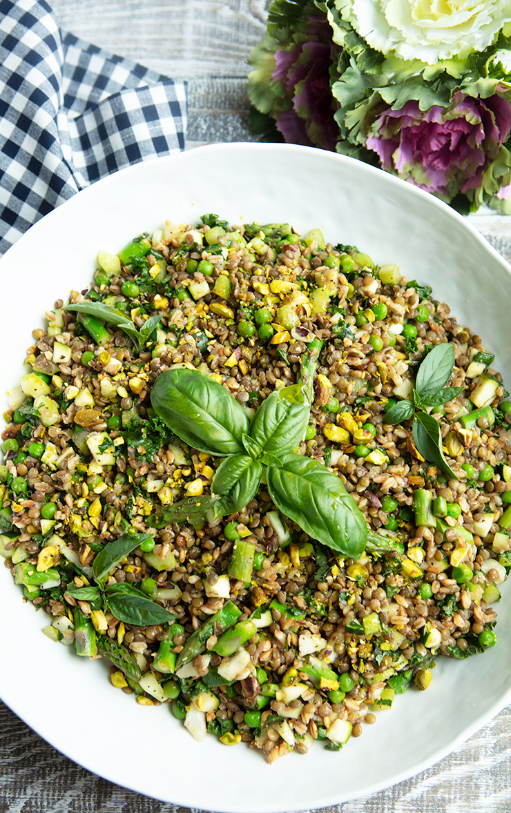 Quando finalmente arriva la primavera, mi piace preparare pasti più leggeri, tra cui alcuni che includono le mie verdure primaverili preferite, come asparagi, fave, piselli e carciofi. Questa insalata è quella che mi piace preparare all’inizio della settimana e poi godermela per alcuni giorni per un’opzione di pranzo abbondante. Ricca di verdure sane, lenticchie, farro ed erbe fresche, ha davvero il sapore della primavera! Uso le lenticchie verdi francesi piccole o le lenticchie italiane beige in questa insalata perché quelle arancioni sono migliori per le zuppe poiché diventano molli una volta cucinate. Ho abbinato le lenticchie con un po’ di farro alle noci per aggiungere nutrimento e sapore. Come tutte le mie insalate, includo verdure crude e appena cotte di colore verde brillante per colore e croccantezza e inserito tutto in un vivace condimento al limone. Questa insalata si conserva bene in frigorifero in un contenitore ermetico per qualche giorno ed è un’ottima opzione per un picnic all’aperto in quanto si confeziona molto bene. Quando preparo un grano, raddoppio sempre la quantità e ne congelo la metà per usarla in seguito. Questa insalata è meglio servirla a temperatura ambiente che permette ai sapori di brillare.