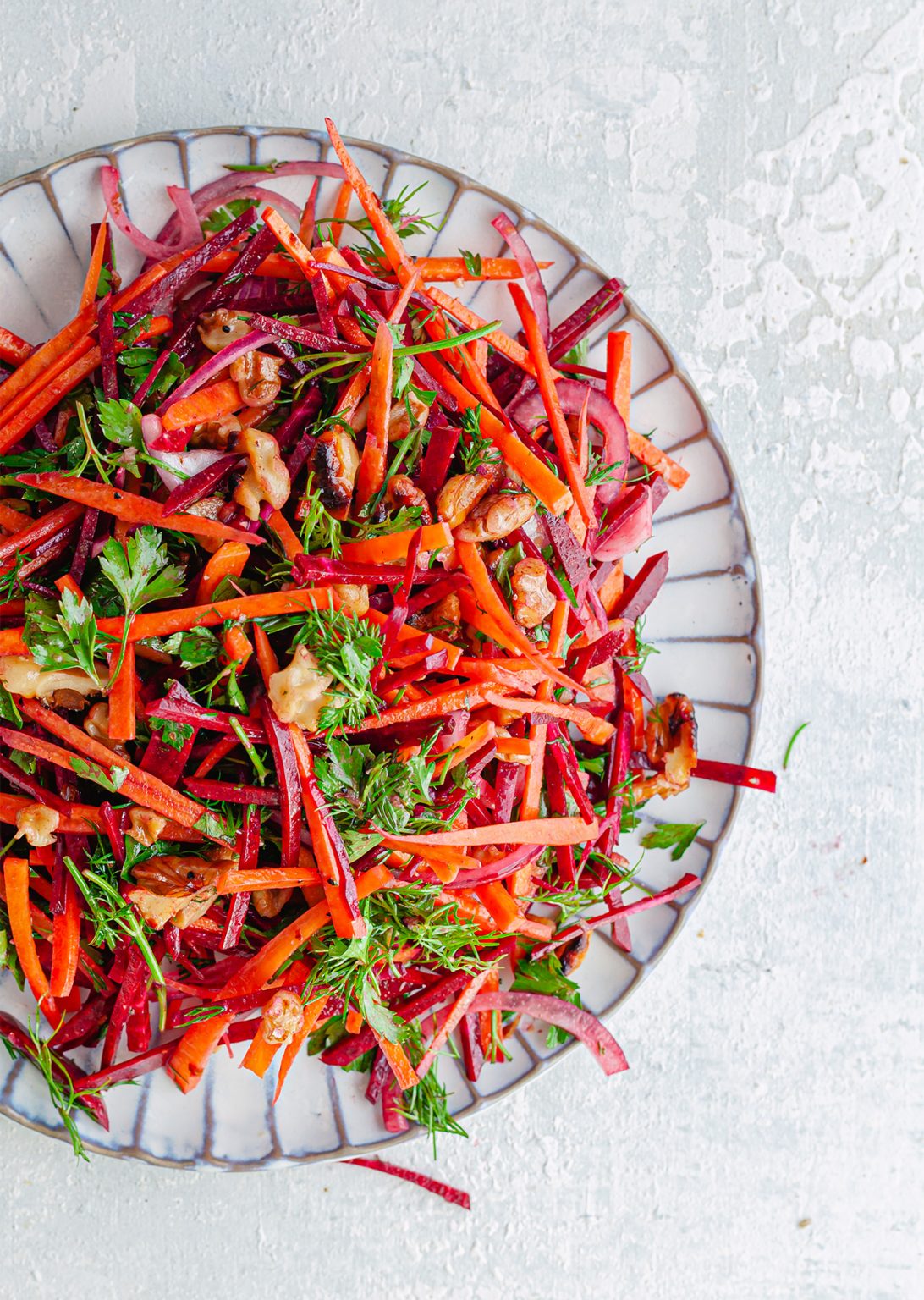 - Aggiungere la barbabietola, la carota, la cipolla rossa, l’aneto e il prezzemolo in una grande ciotola.
