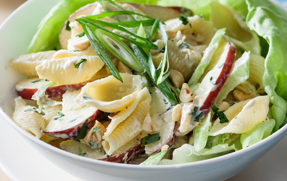 Lavate accuratamente la mela verde, asciugatela con un canovaccio, tagliatela a fette sottili e ponetela in un contenitore con il succo di limone. Mescolate e lasciatela macerare fino al momento del suo utilizzo. Lessate la pasta in abbondante acqua salata e in ebollizione. A cottura avvenuta, scolatela e mettetela da parte in un’insalatiera capiente. Condite la pasta con la mela verde e tutti gli ingredienti citati nella ricetta a eccezione della foglia di sedano e del peperoncino in polvere. Mescolate con un cucchiaio prima di servire la pasta in tavola spolverizzatela e guarnitela con un foglio di sedano.