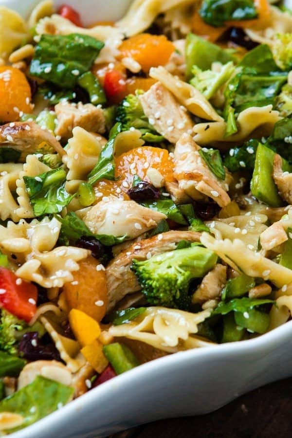 Il pollo teriyaki carico di verdure, mandarini, pasta e, naturalmente, un condimento al sesamo costituisce l’insalata di pasta con pollo teriyaki più gustosa di sempre!