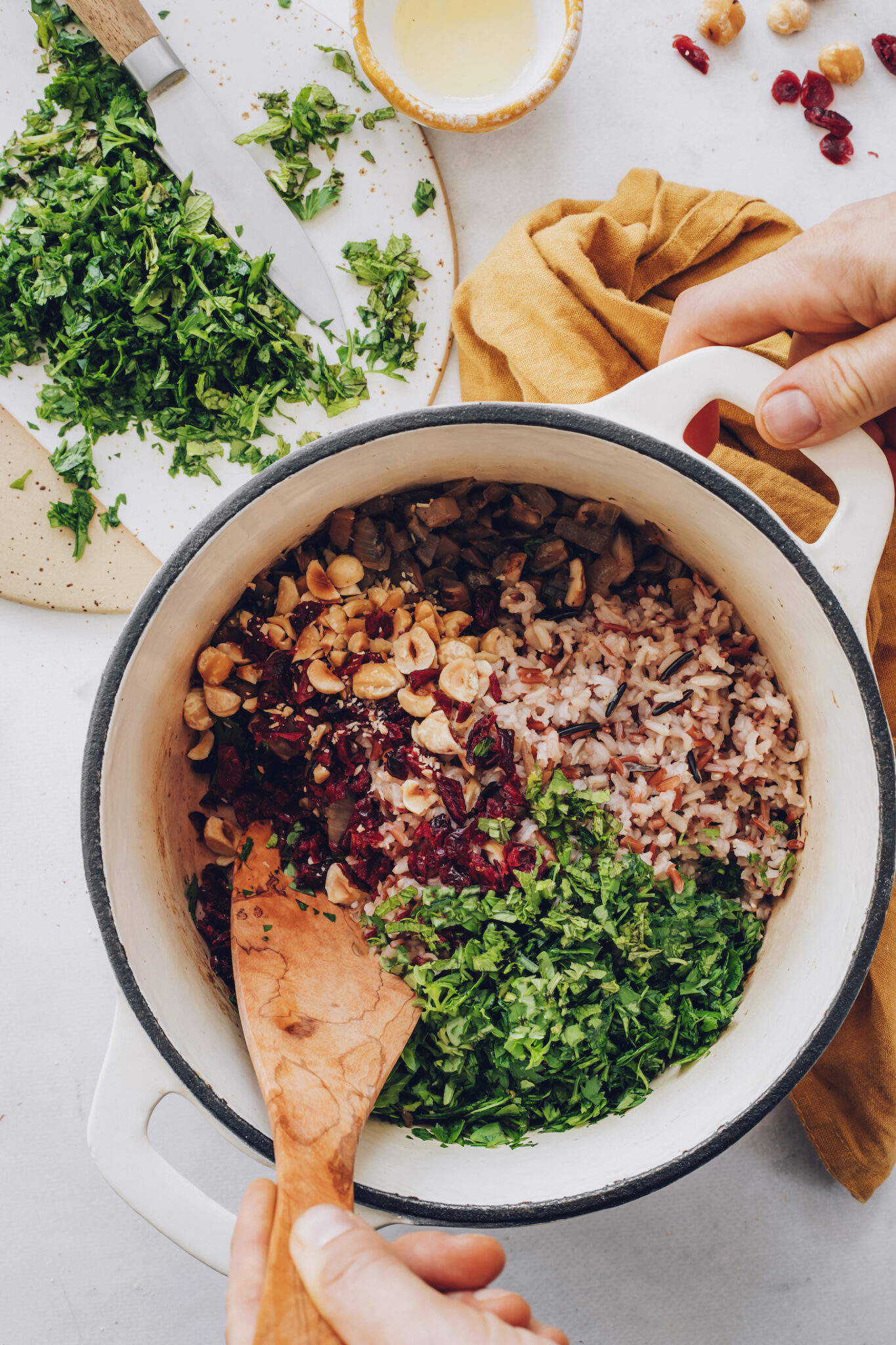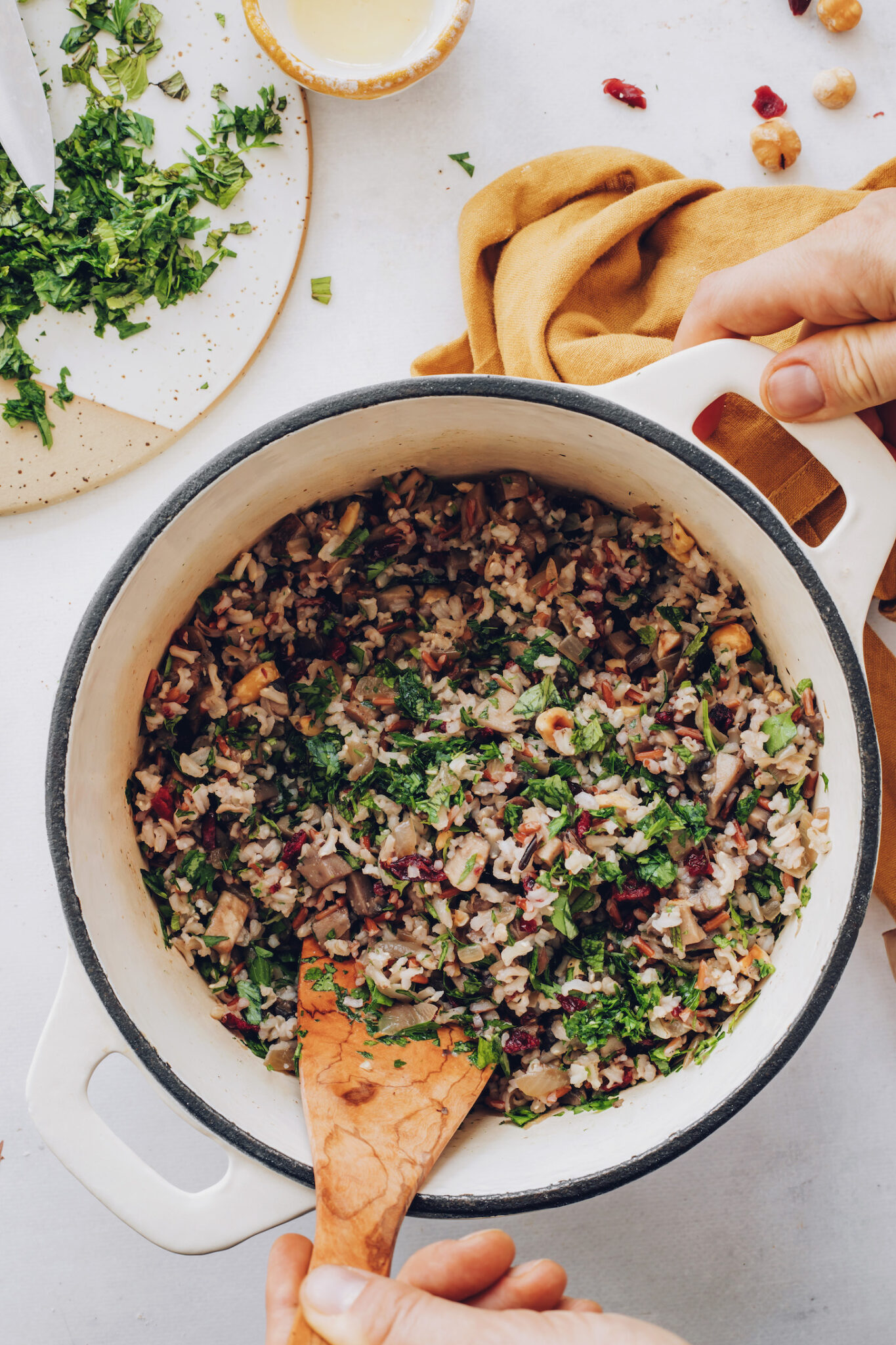 - In una grande ciotola da portata (o nella padella che hai usato per cucinare se è abbastanza grande), aggiungi il riso cotto, le cipolle e i funghi saltati, i mirtilli rossi, le nocciole tostate, il prezzemolo, la menta e l’origano. Mescolare fino a quando ben combinato.