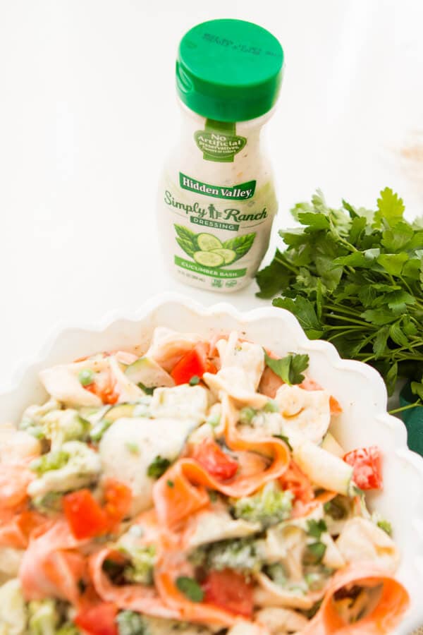 Usa un pelapatate per fare nastri di verdure per questa ricetta di insalata di tortellini ranch di 10 minuti che è un contorno facile e veloce per i barbecue!