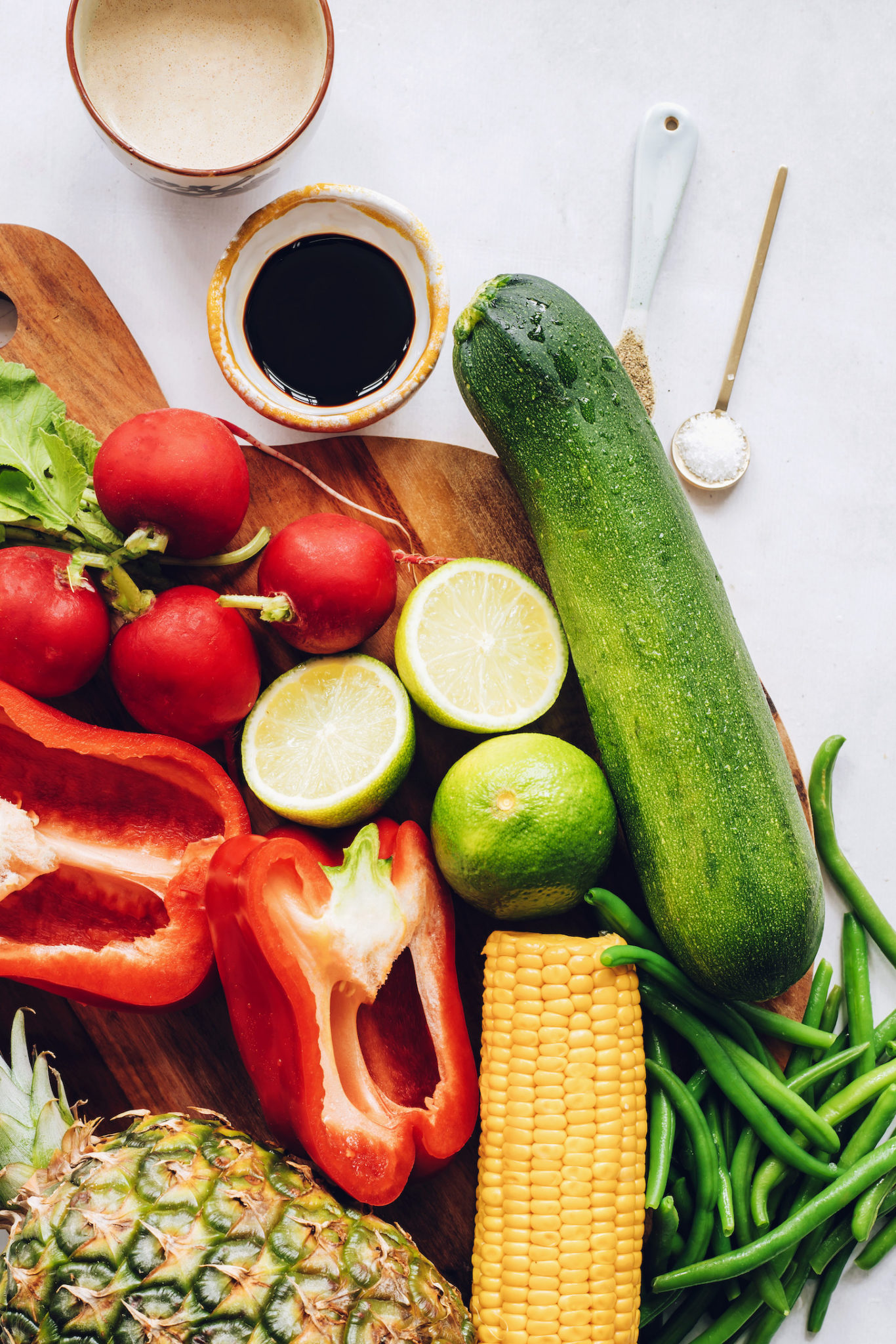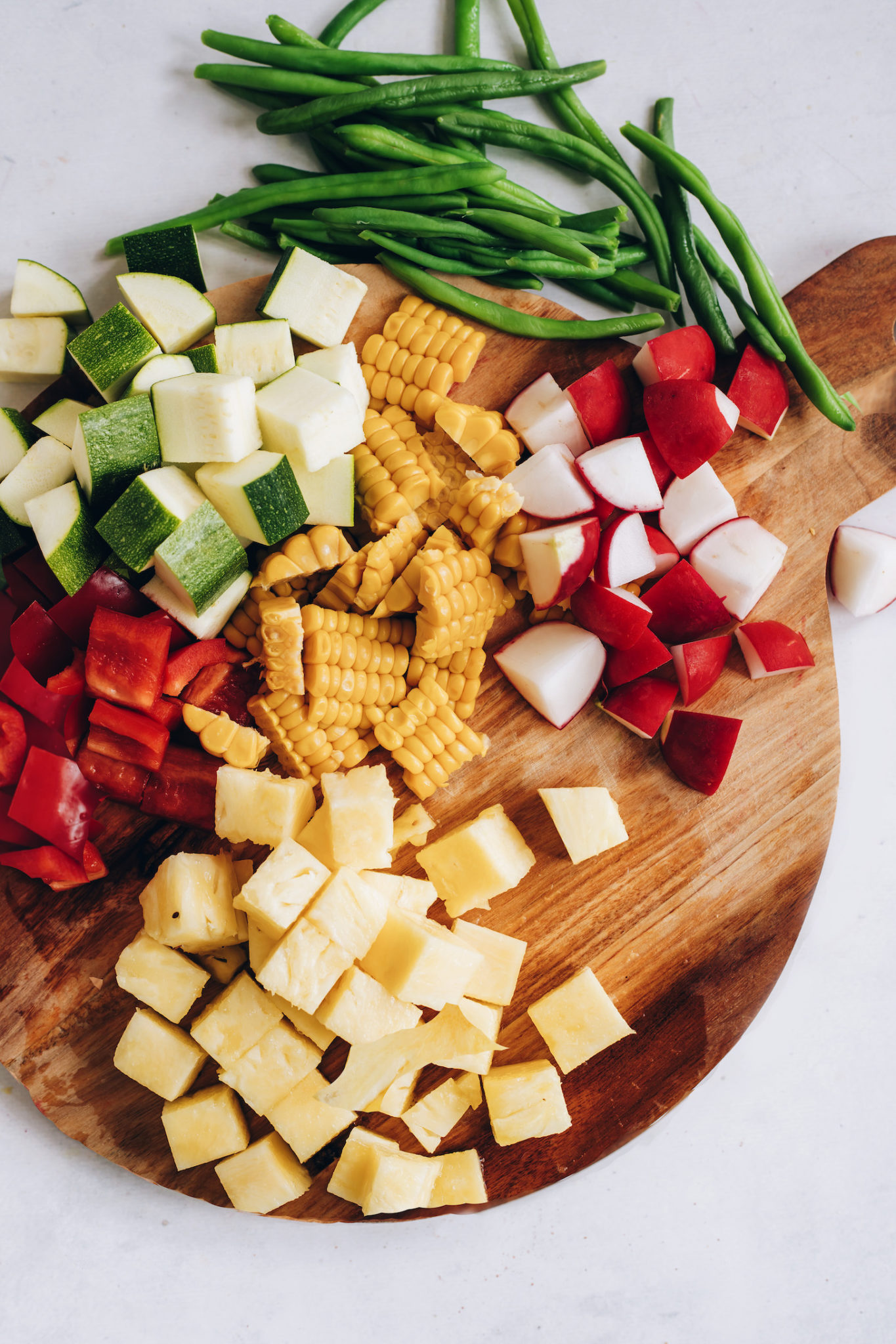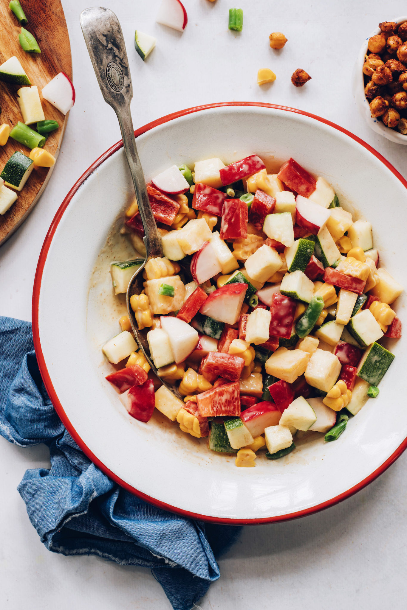 Questa insalata è piena di prodotti freschi e croccanti di stagione tra cui mais, zucchine, peperoni rossi, fagiolini e ravanelli. L’ananas aggiunge un elemento naturalmente dolce e fruttato per portarlo al livello successivo!