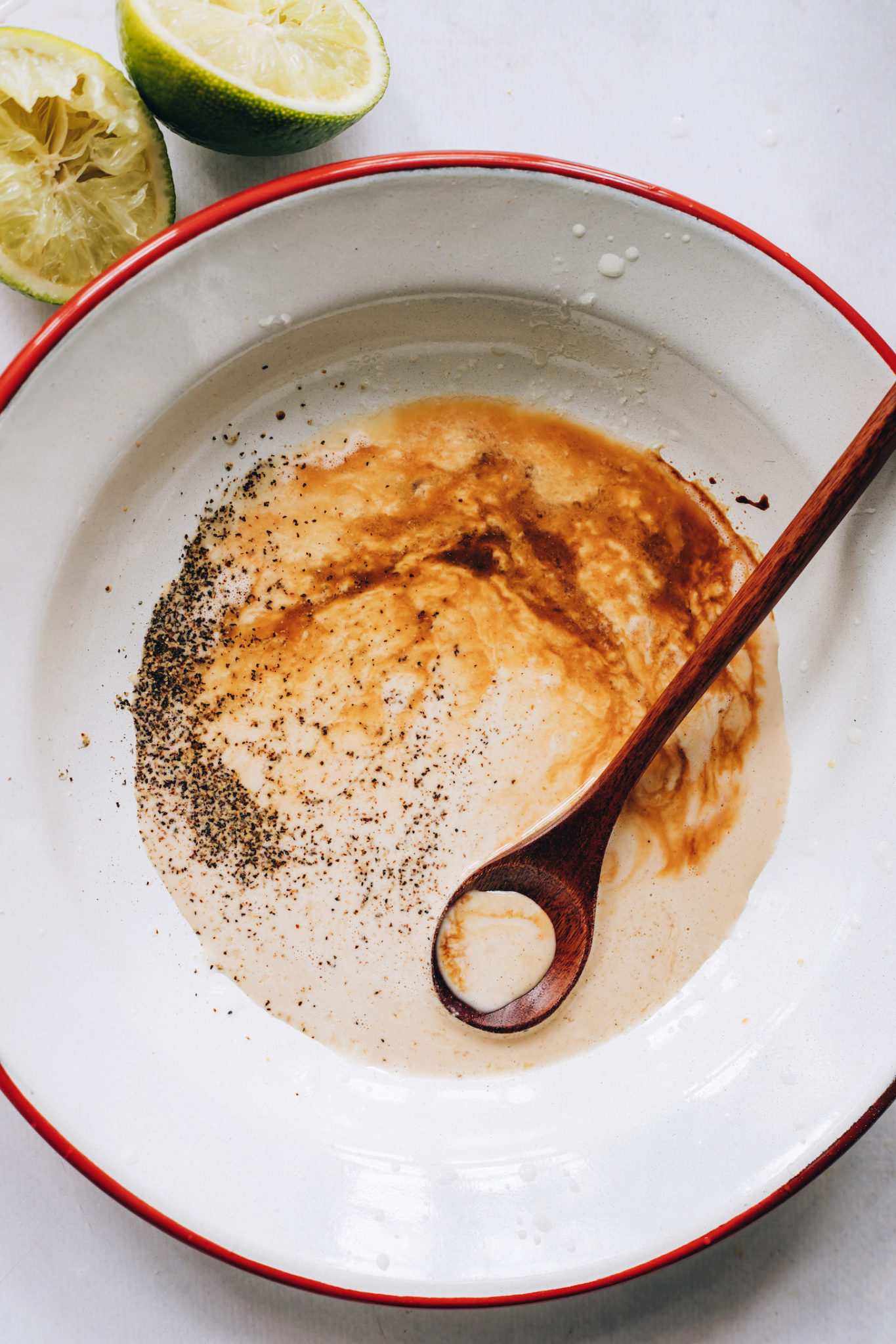 Il condimento non potrebbe essere più semplice è fatto mescolando tahini cremoso con succo di lime per la piccantezza, cocco aminos per un elemento dolce-salato e sale e pepe per un sapore aggiunto.