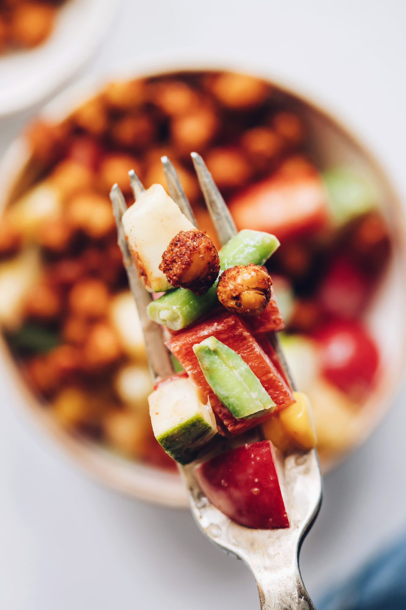 Quella che era iniziata come un’insalata estiva di panzanella si è magicamente trasformata nell’insalata estiva più frizzante, fresca, deliziosa e cremosa del quartiere. Abbiamo sostituito i crostini di pane con i ceci croccanti al barbecue super saporiti (opzionali ma consigliati), che aggiungono molte proteine e fibre vegetali. E abbiamo saltato le verdure e siamo andati dritti per un arcobaleno di verdure fresche tritate e ananas fresco per il massimo sapore.
