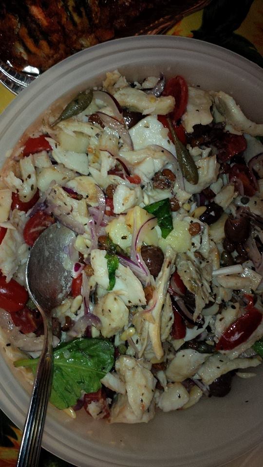 Mettere a bollire, in una pentola capiente, acqua con alloro e un paio di fette di limone. Il segreto per uno stocco lesso alla perfezione, sodo e compatto, è quello di non aggiungere sale nell’acqua. Quando questa bolle si può immergere lo stocco, ancora senza senza aggiungere sale. Dalla ripresa del bollore lasciare bollire per circa 15 minuti se lo stocco è un pezzo intero, altrimenti, se è già tagliato in pezzi, bastano solo 8 minuti dalla ripresa del bollore. Solo alla fine aggiungere il sale e lasciare lo stocco a raffreddare nell’ acqua della bollitura. Nel frattempo pulite, lavate e deliscate le acciughe sotto sale che vanno poi sciolte in padella con un pò di olio, a fuoco bassissimo. Quando lo stocco nella pentola sarà abbastanza freddo da ridurlo in scaglie, si potrà ripulirlo dalla pelle e versarlo in piatto di portata capiente. A questo punto aggiungere tutti gli altri ingredienti versandoli sullo stocco e mescolare. E’ importante che i vari ingredienti siano conditi singolarmente e poi uniti allo stocco lesso. Un’altra accortezza per realizzare al meglio questa fantasia di stocco in insalata, è quella che tutti gli ingredienti conditi a parte singolarmente rilascino i loro intingoli che poi messi insieme armonizzano ed equilibrano il gusto. Adesso condire con olio, rimescolare il tutto e lasciare riposare fino a servire. A piacere si può ultimare con una spolverata di peperoncino, e pepe bianco.