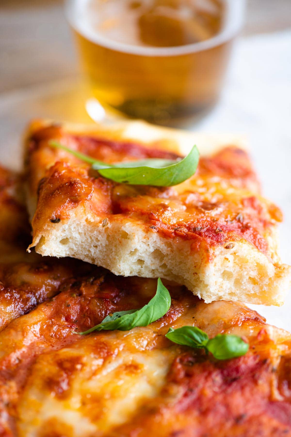 Vivendo in Italia uno dei miei snack preferiti era una grossa fetta di focaccia. È morbido e soffice con una crosta croccante e deliziosa, condita con pomodoro e mozzarella. È molto simile alla pizza al taglio (pizza al trancio) ma viene utilizzato un impasto leggermente diverso.