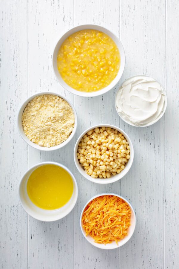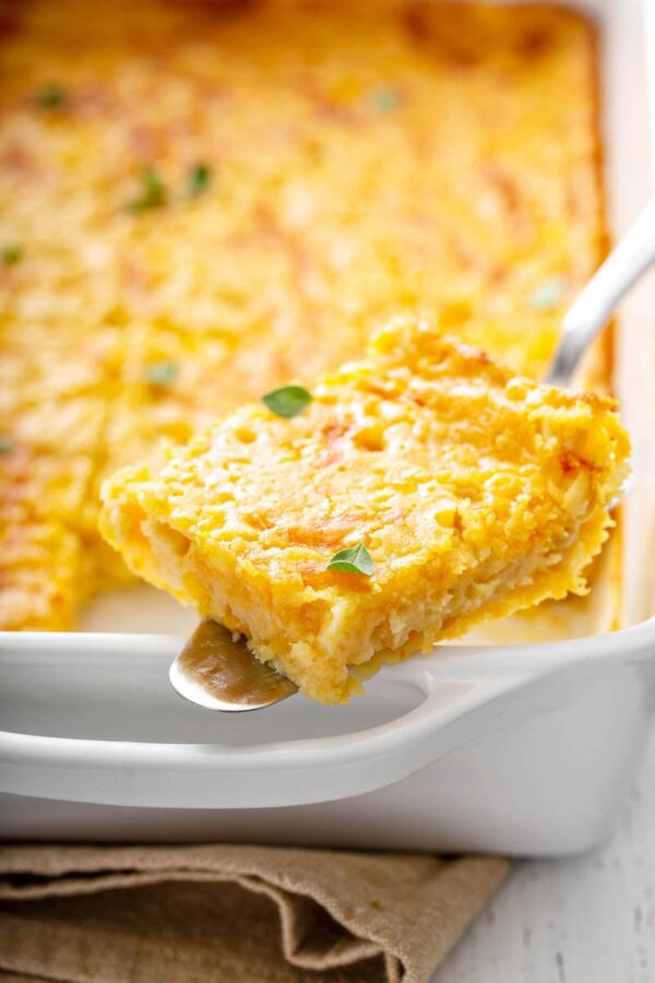 Questa ricetta dolce e salata della teglia di mais è un delizioso incrocio tra il soufflé di mais e un budino di mais dolce! È facile da preparare e si abbina perfettamente a qualsiasi pasto!
